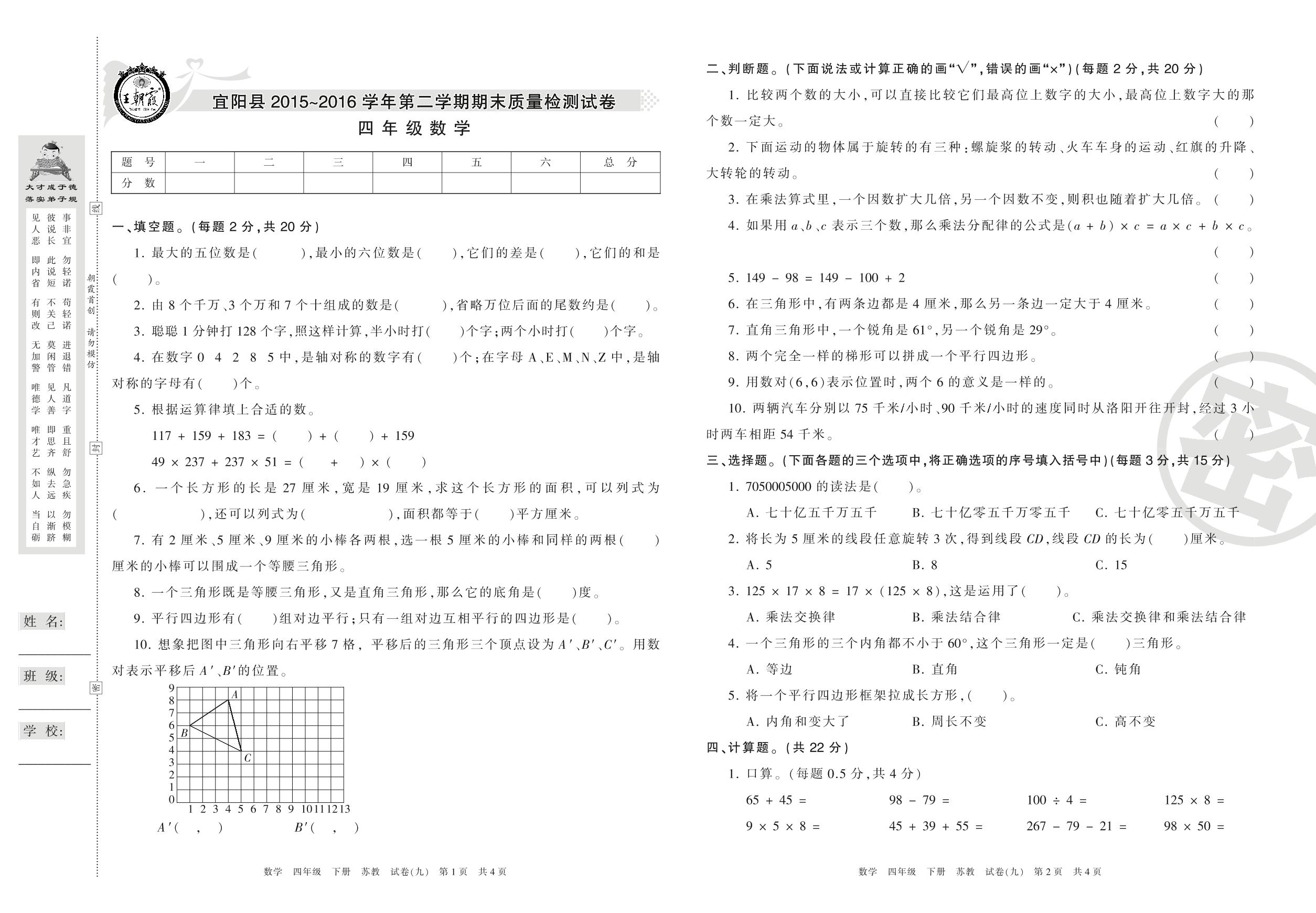 2015-2016学年第二学期洛阳市宜阳县四年级数学试卷(苏教版)【9】