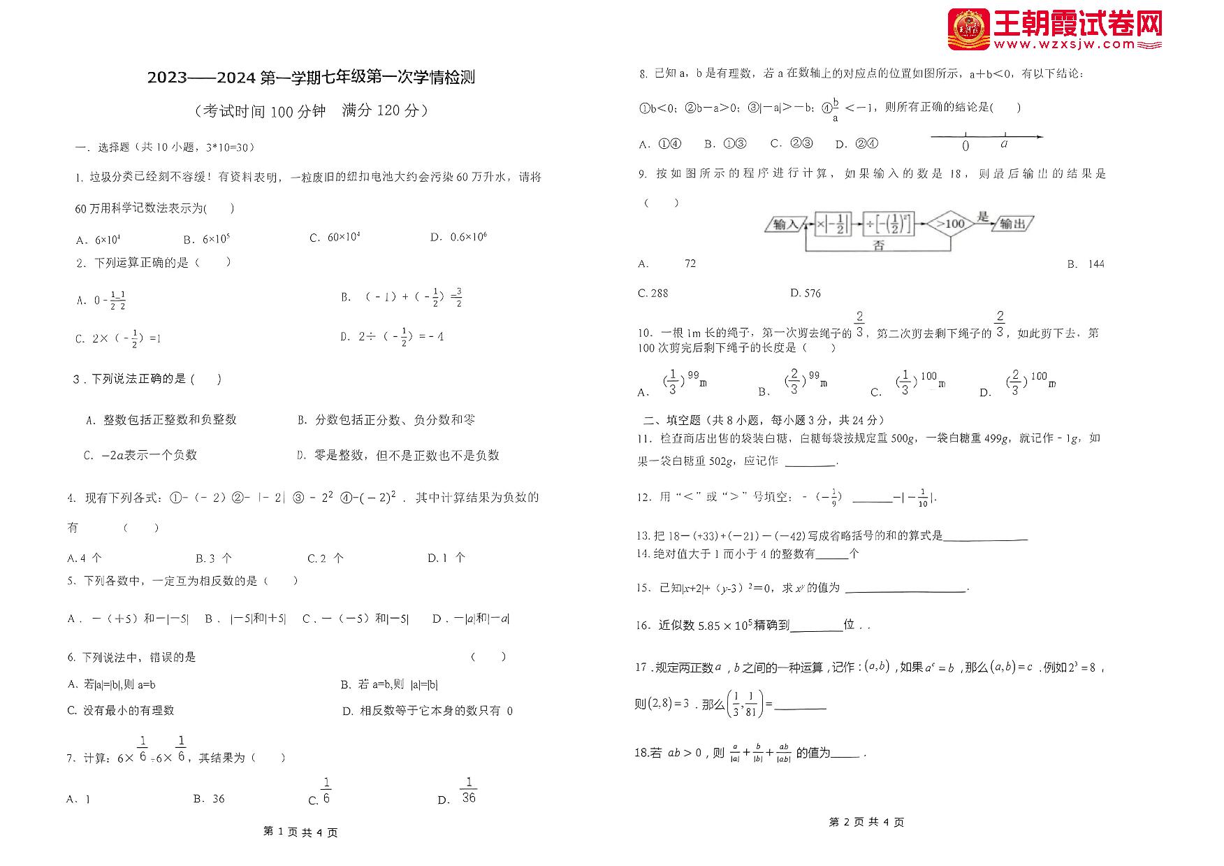 安徽省淮南市凤台县第四中学2023—2024学年第一学期(月考)第一次学情检测七年级数学(人教版)