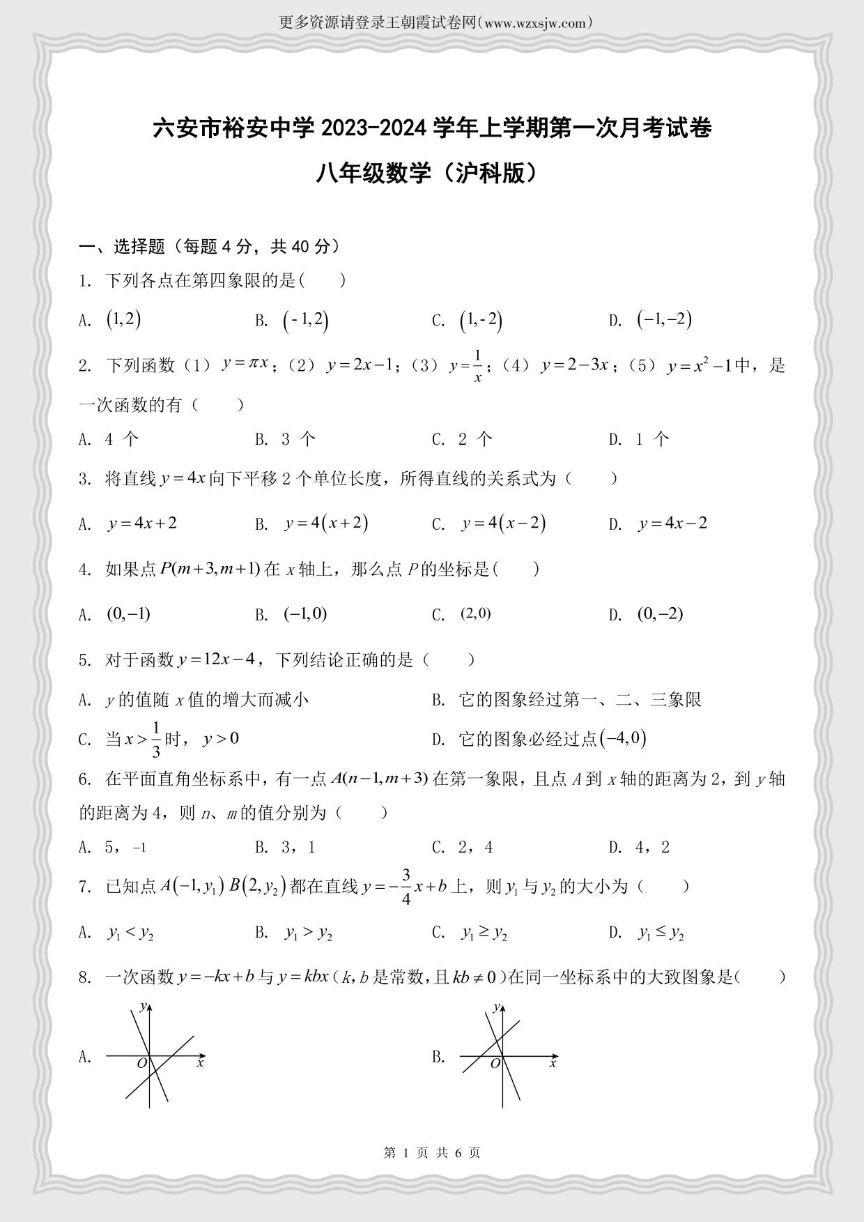 安徽省六安市裕安中学2023-2024学年上学期第一次月考试卷八年级数学(沪科版)