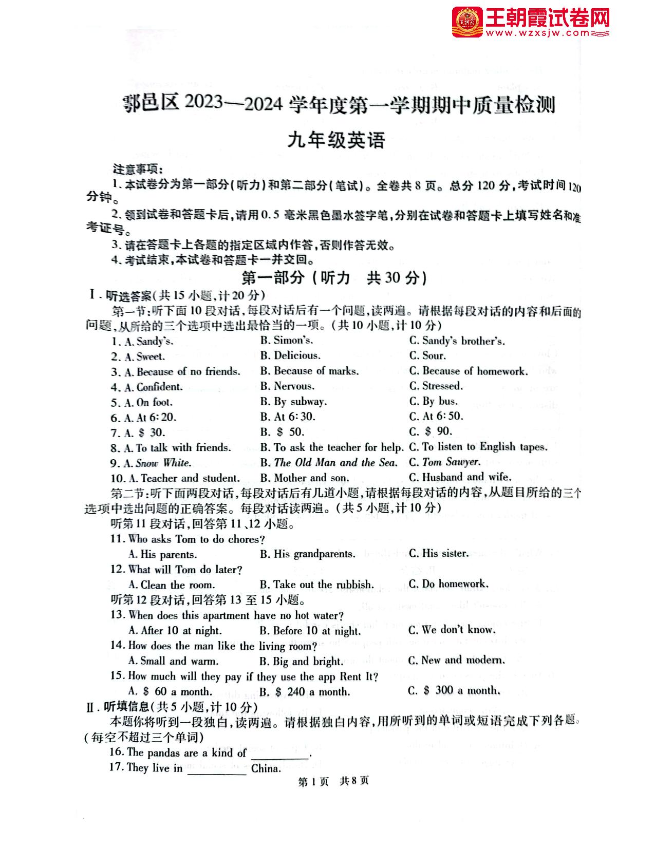 陕西省西安市鄠邑区东关初级中学2023-2024学年第一学期期中质量检测试卷九年级英语(人教版)