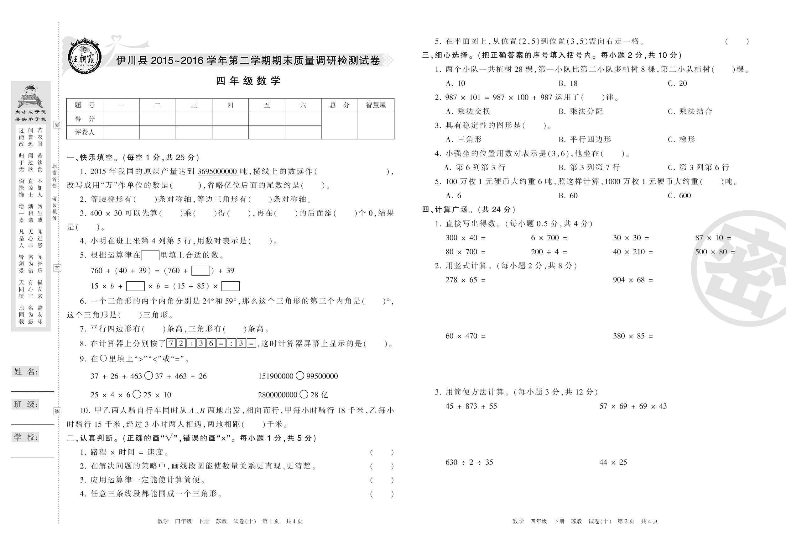 2015-2016学年第二学期洛阳市伊川县四年级数学试卷(苏教版)【10】