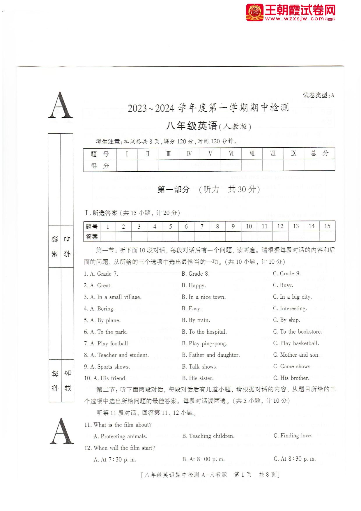 八年级英语人教版上册期中卷