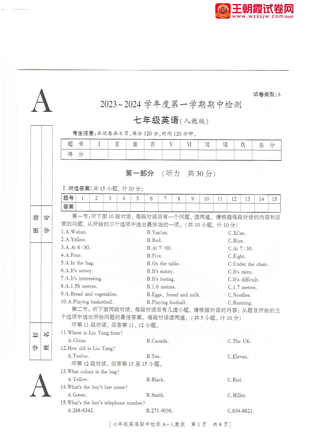 陕西省榆林市定边县第七中学2023-2024学年第一学期期中检测七年级英语(人教版)【无听力音频】
