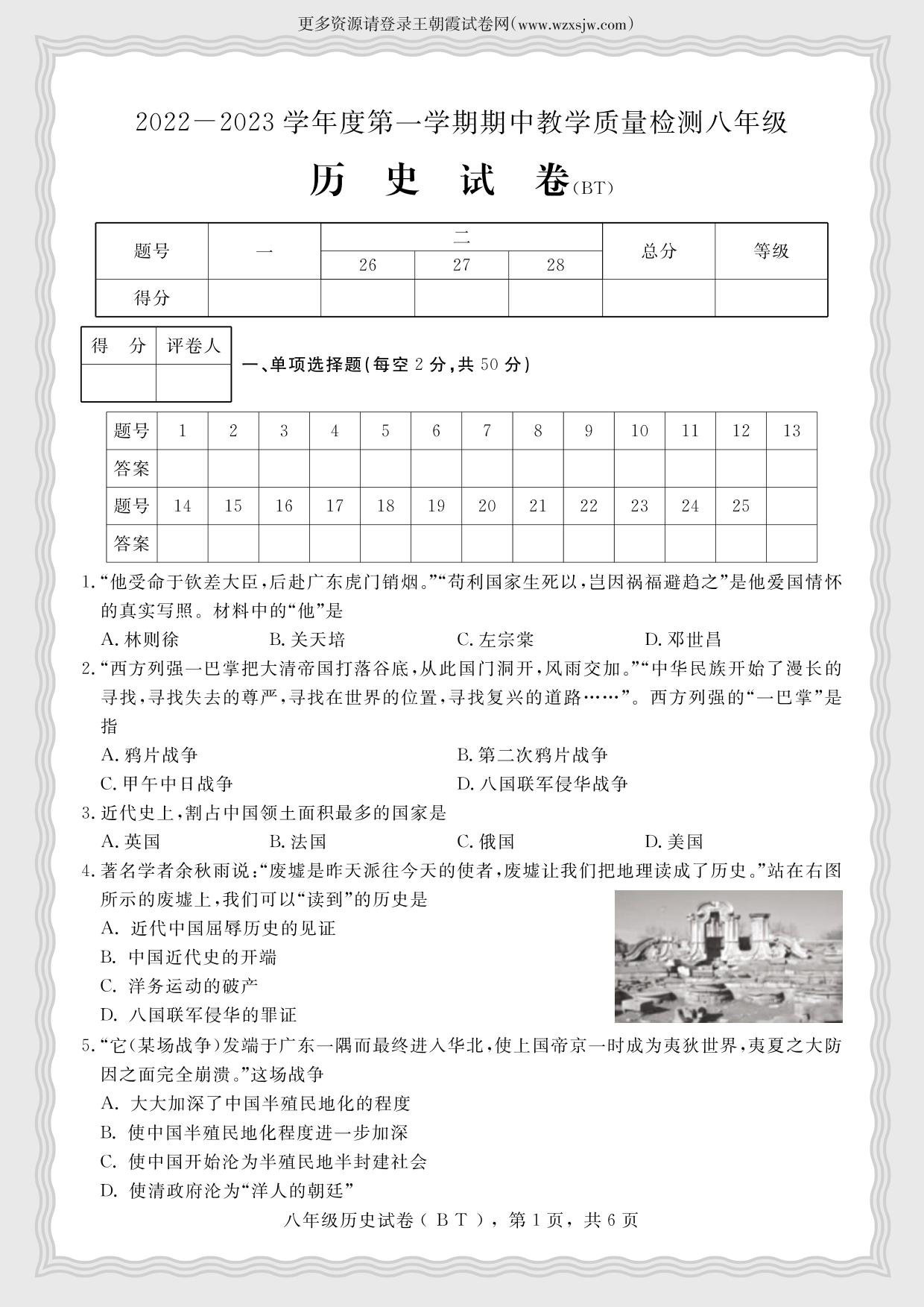 河北省沧州市泊头市2022-2023学年度第一学期期中教学质量检测八年级历史(人教版)
