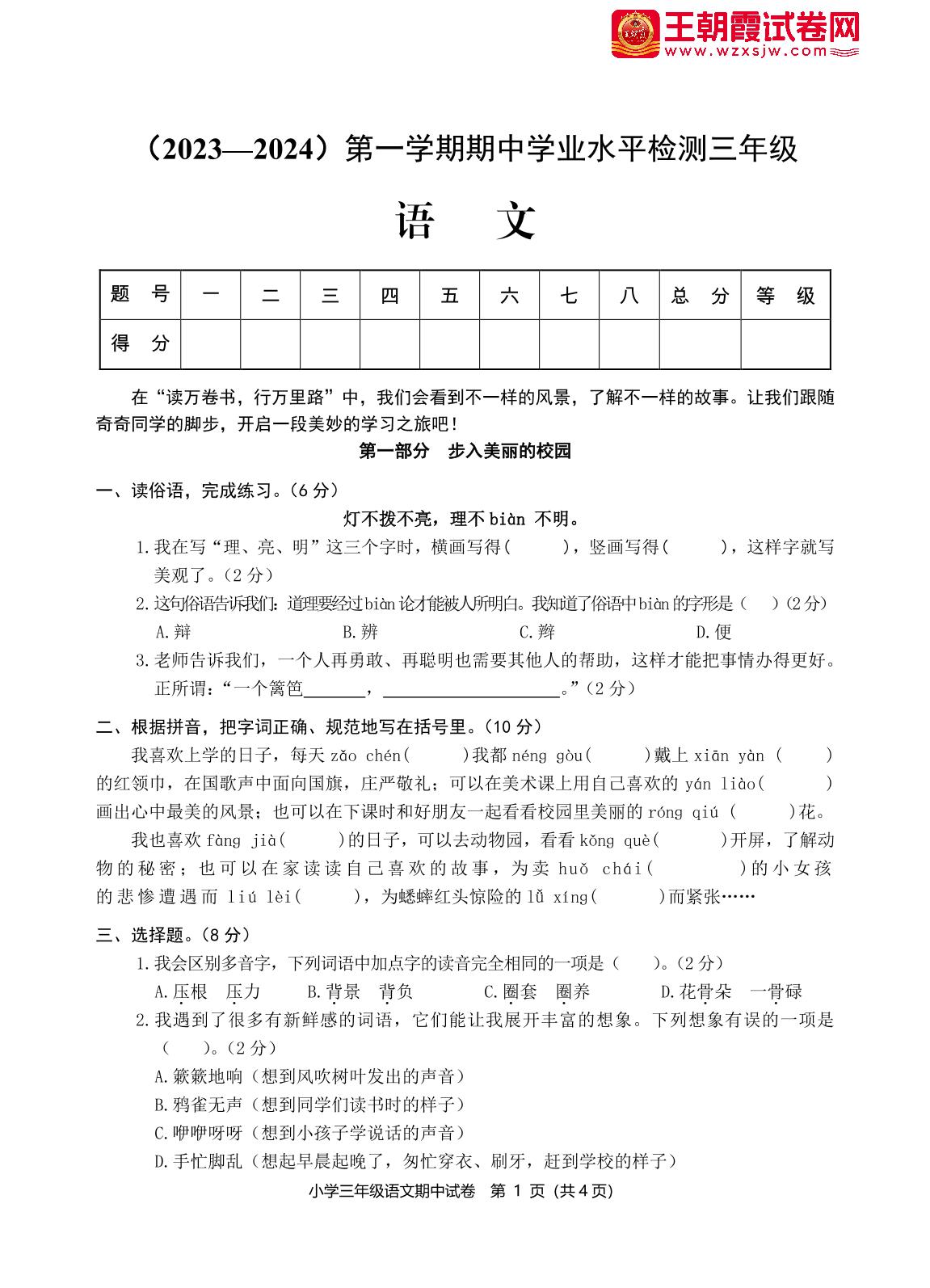 三年级语文人教版上册期中卷
