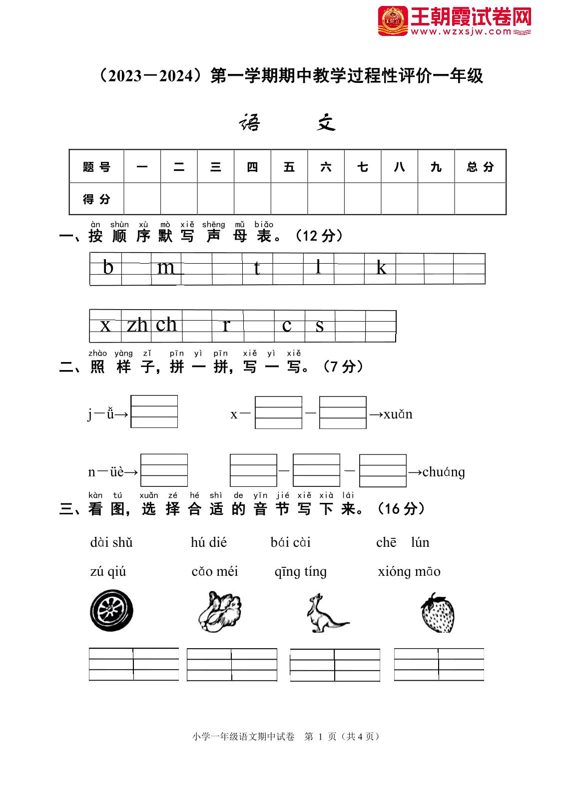 湖北省孝感市应城市2023-2024学年第一学期期中教学过程性评价一年级语文(人教版)