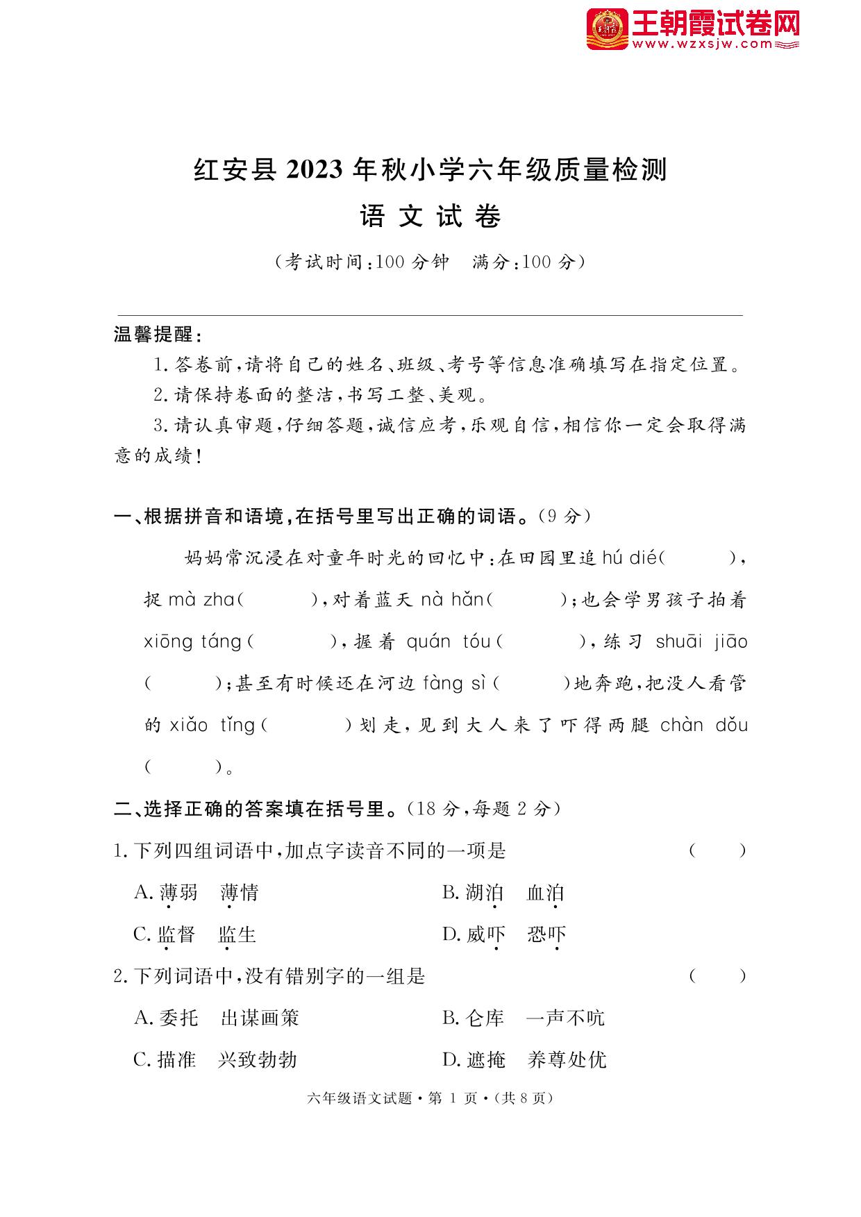 湖北省黄冈市红安县2023-2024学年第一学期质量检测(月考)六年级语文(人教版)