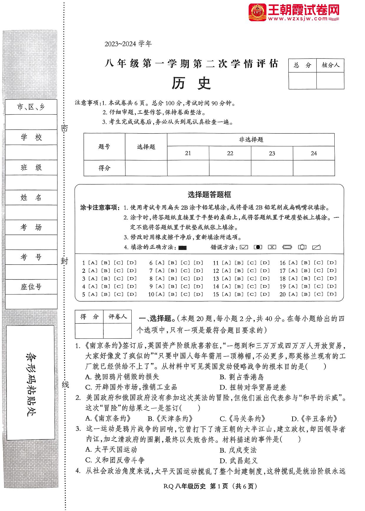 河北省沧州市任丘市第八中学2023-2024学年第一学期第二次学情评估(期中)八年级历史(人教版)