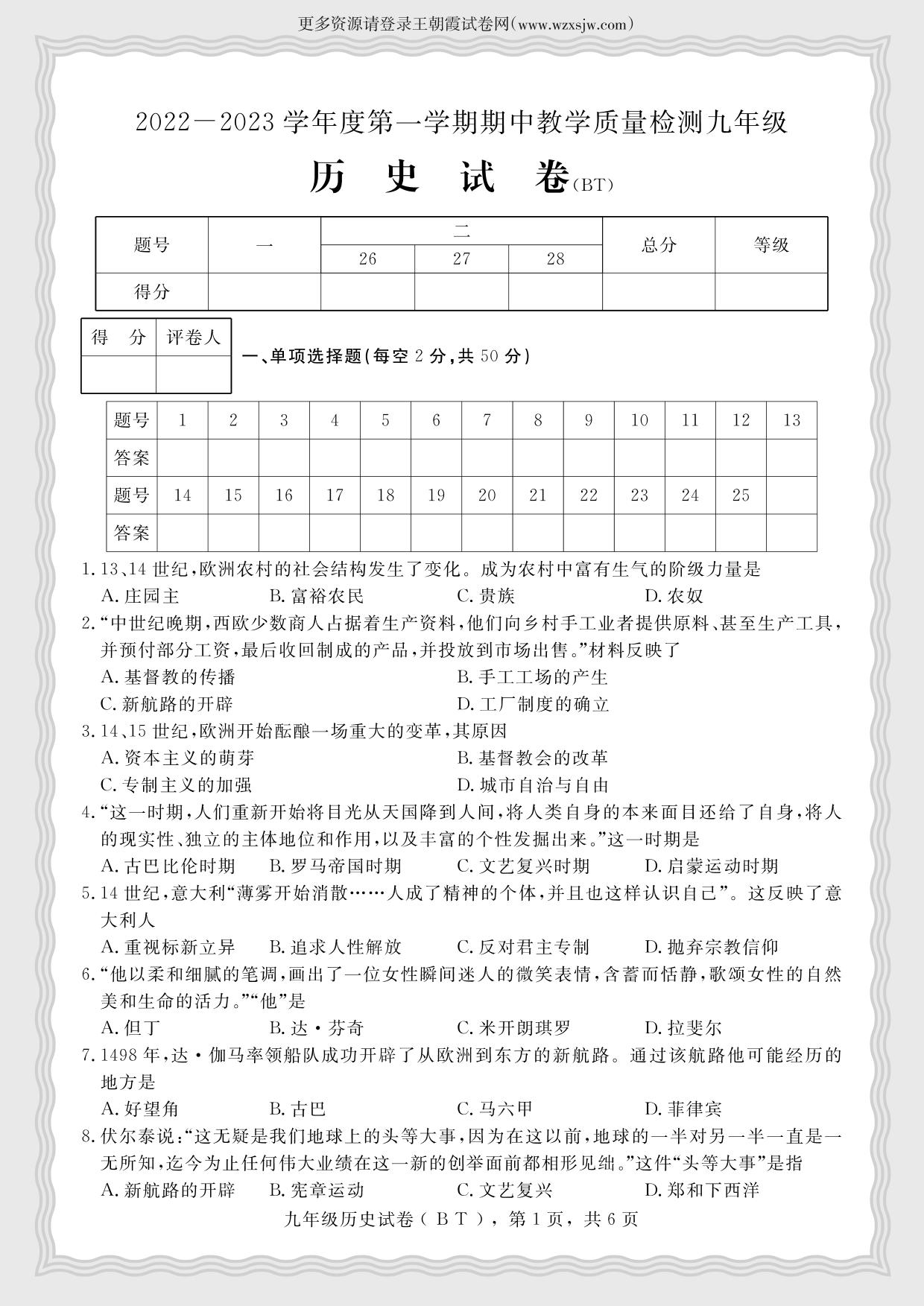 河北省沧州市泊头市2022-2023学年度第一学期期中教学质量检测九年级历史(人教版)