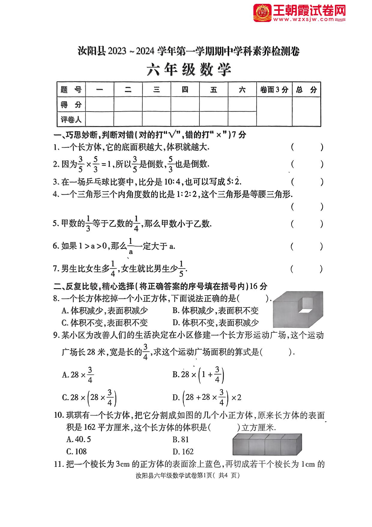 河南省洛阳市汝阳县2023-2024学年第一学期期中学科素养检测卷六年级数学(苏教版)