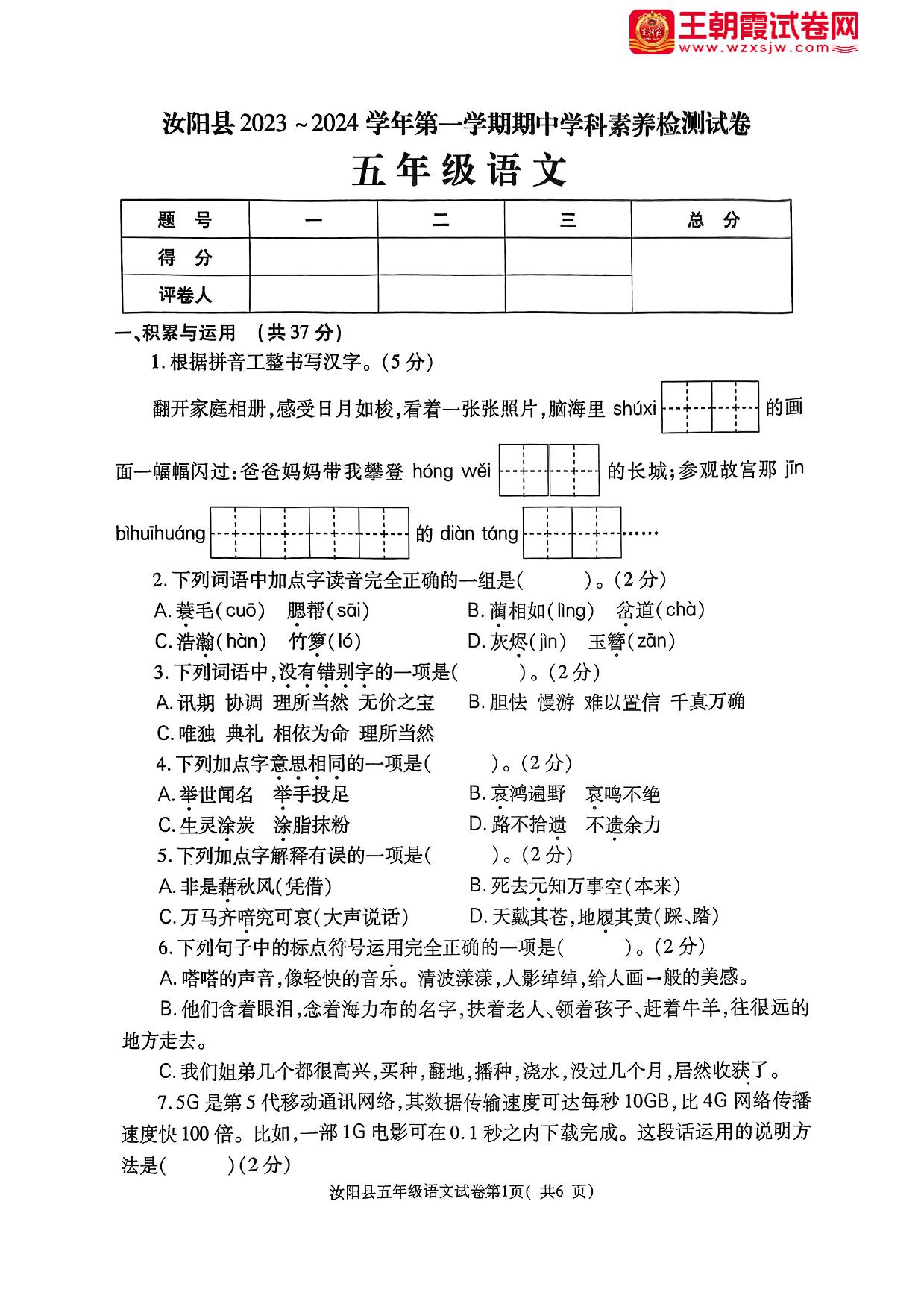 河南省洛阳市汝阳县2023-2024学年第一学期期中学科素养检测卷五年级语文(人教版)