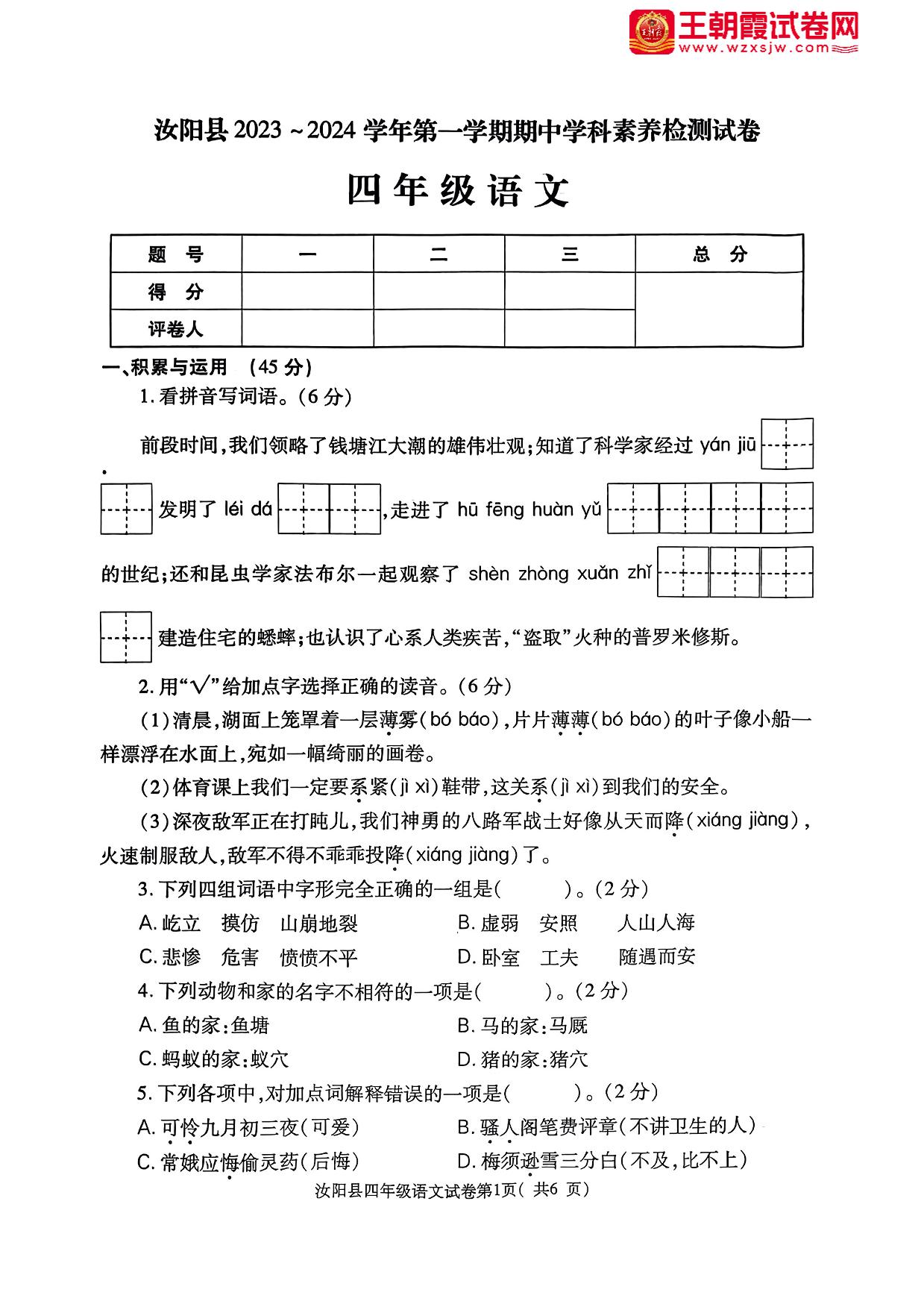 河南省洛阳市汝阳县2023-2024学年第一学期期中学科素养检测卷四年级语文(人教版)