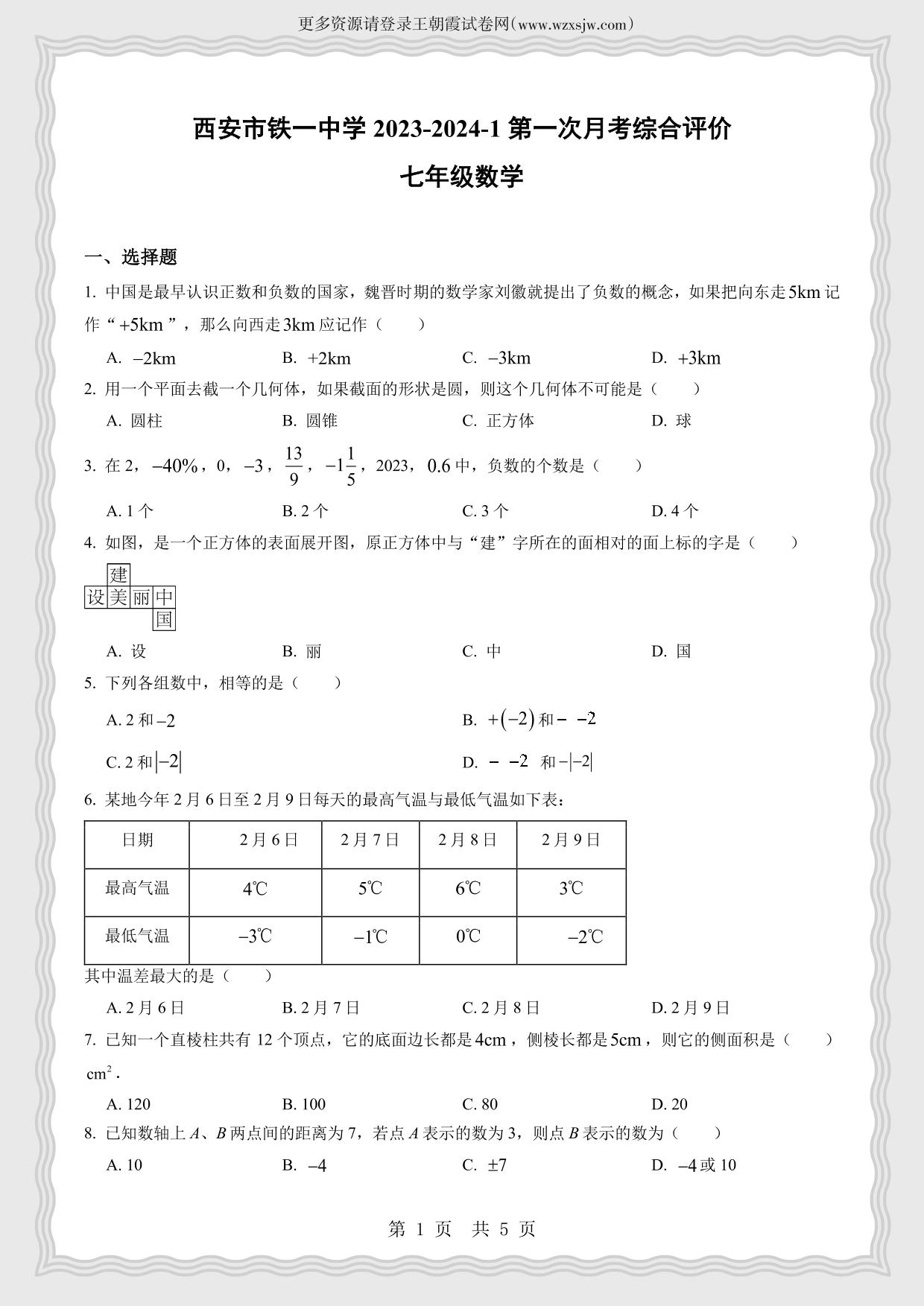 陕西省西安市铁一中学2023-2024学年第一学期第一次月考综合评价七年级数学(北师版)