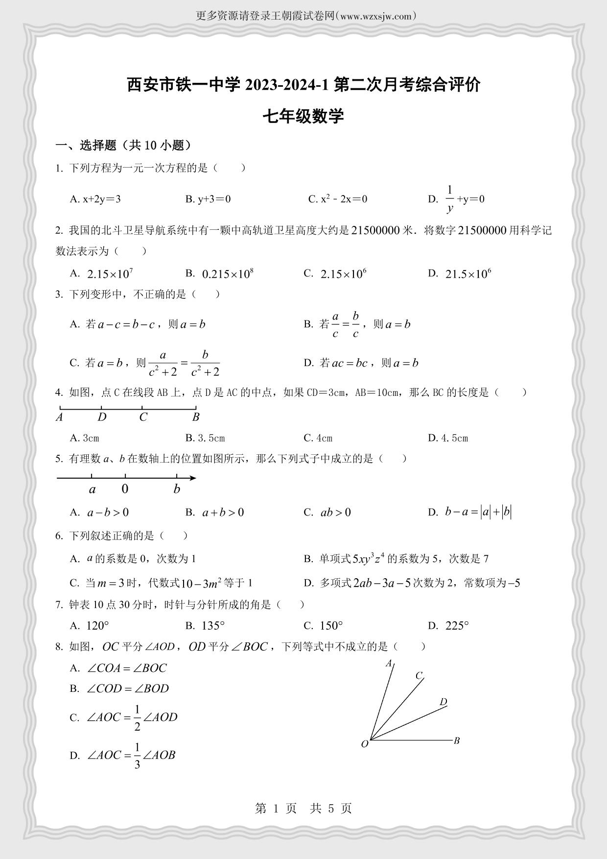 陕西省西安市铁一中学2023-2024学年第一学期第二次月考(期中)综合评价七年级数学(北师版)