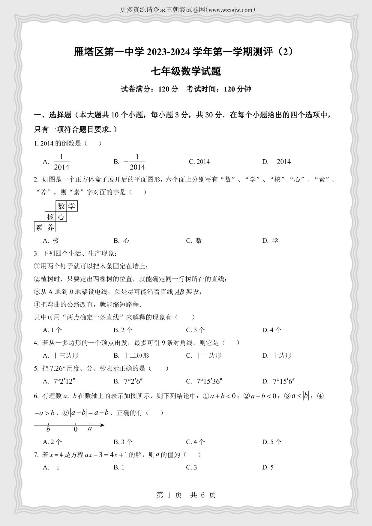 陕西省西安市雁塔区第一中学2023-2024学年第一学期期中测评七年级数学(北师版)