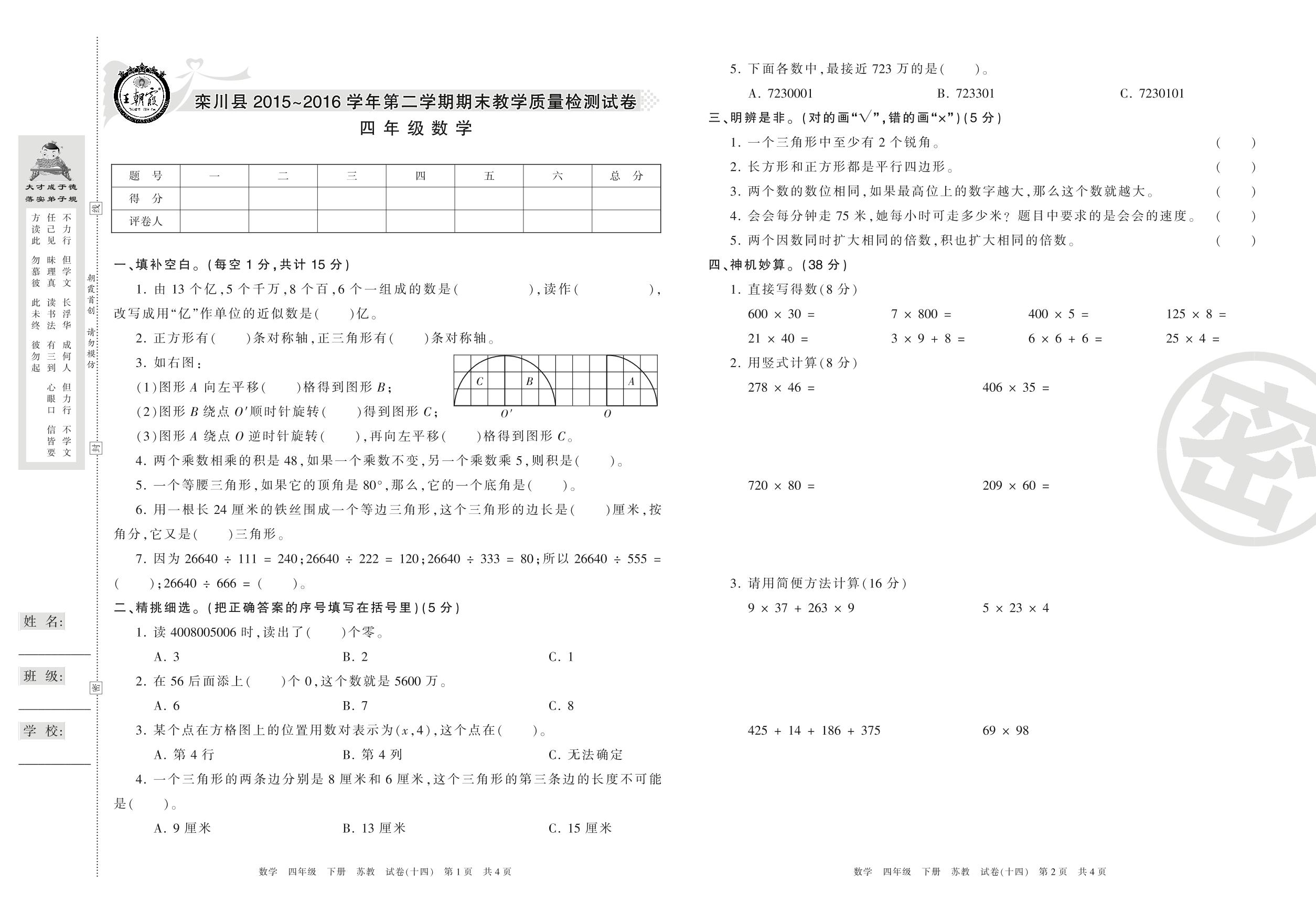 2015-2016学年第二学期洛阳市栾川县四年级数学试卷(苏教版)【14】