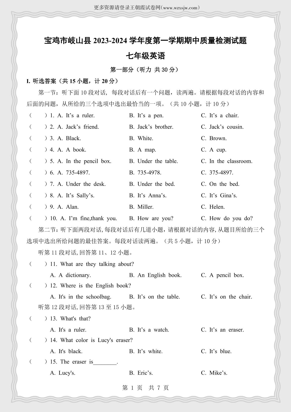 陕西省宝鸡市岐山县2023-2024学年度第一学期期中质量检测试题七年级英语(人教版)【无听力音频】