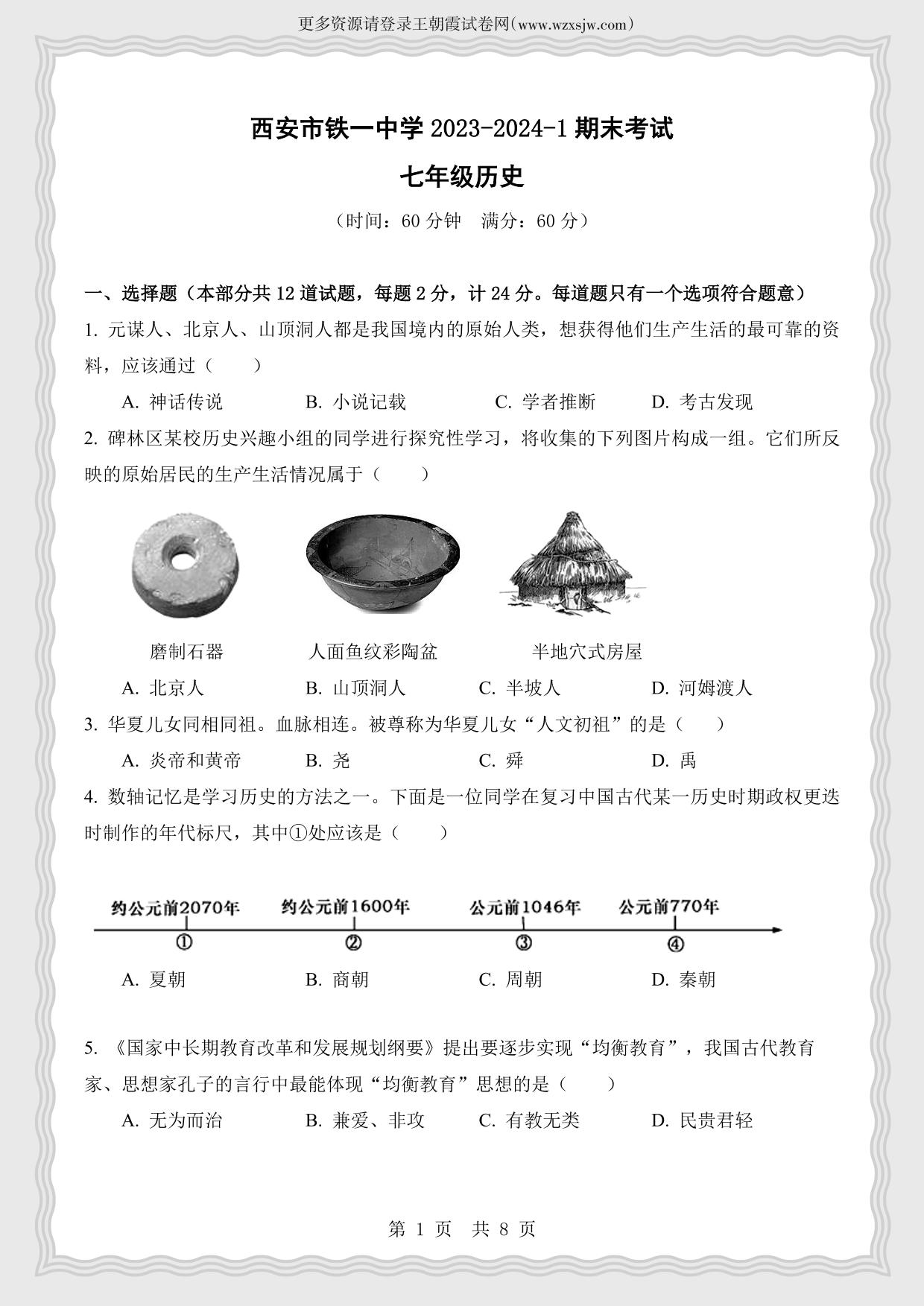 ※陕西省西安市铁一中学2023-2024学年第一学期期末试卷七年级历史(人教版)