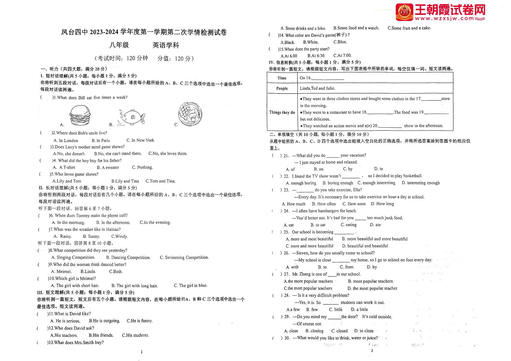 安徽省淮南市凤台县第四中学2023~2024学年度第一学期(期中)第二次学情检测试卷八年级英语(人教版)【无听力音频】