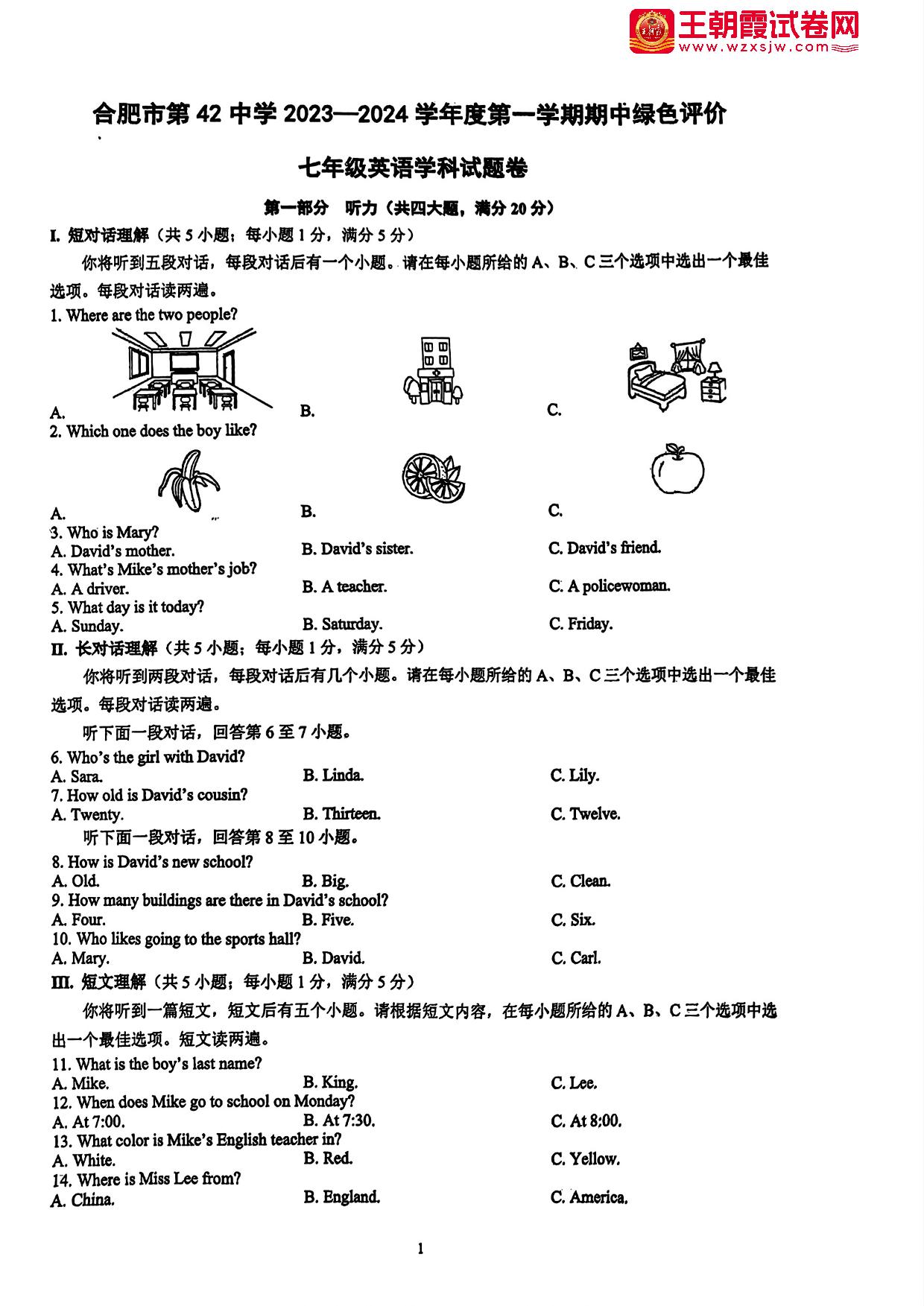 安徽省合肥市第四十二中学2023-2024学年度第一学期期中绿色评价七年级英语(人教版)【无听力音频】