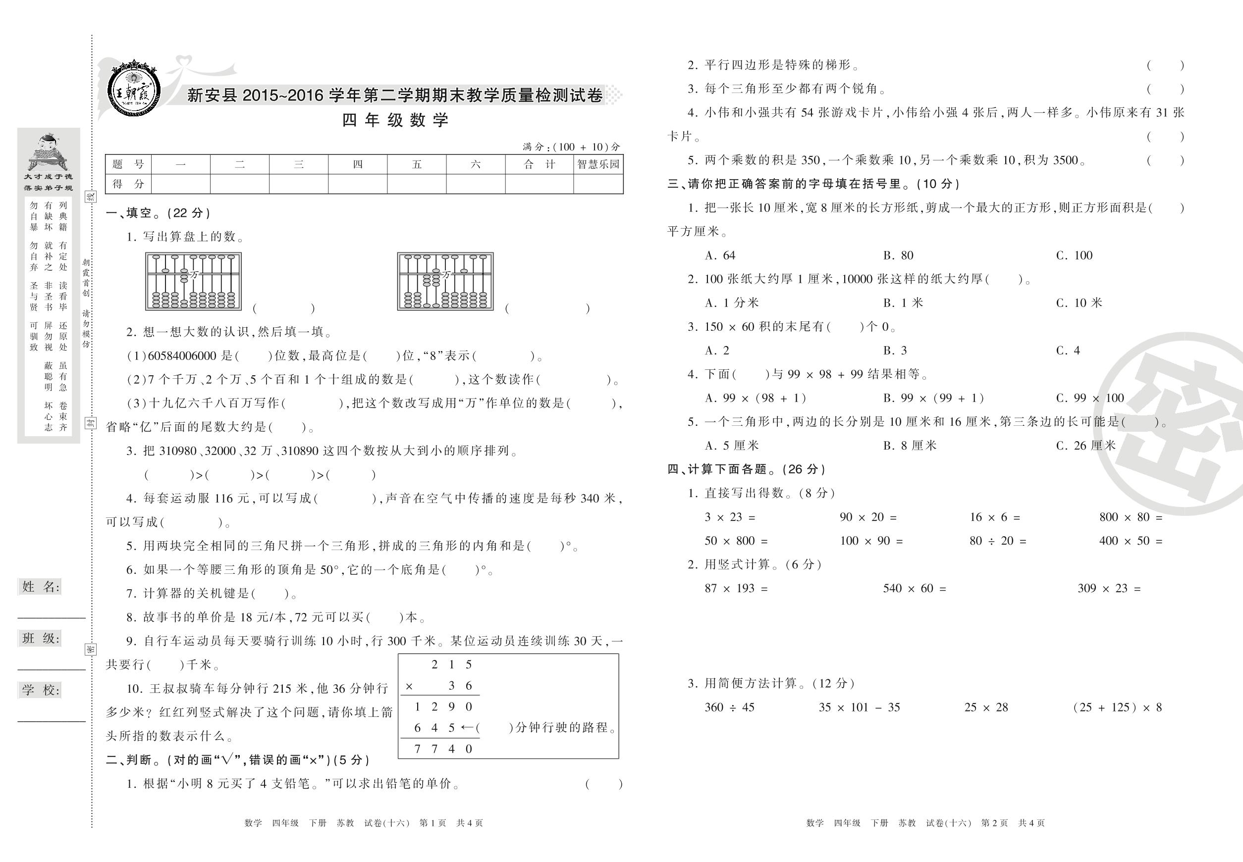 2015-2016学年第二学期洛阳市新安县四年级数学试卷(苏教版)【16】
