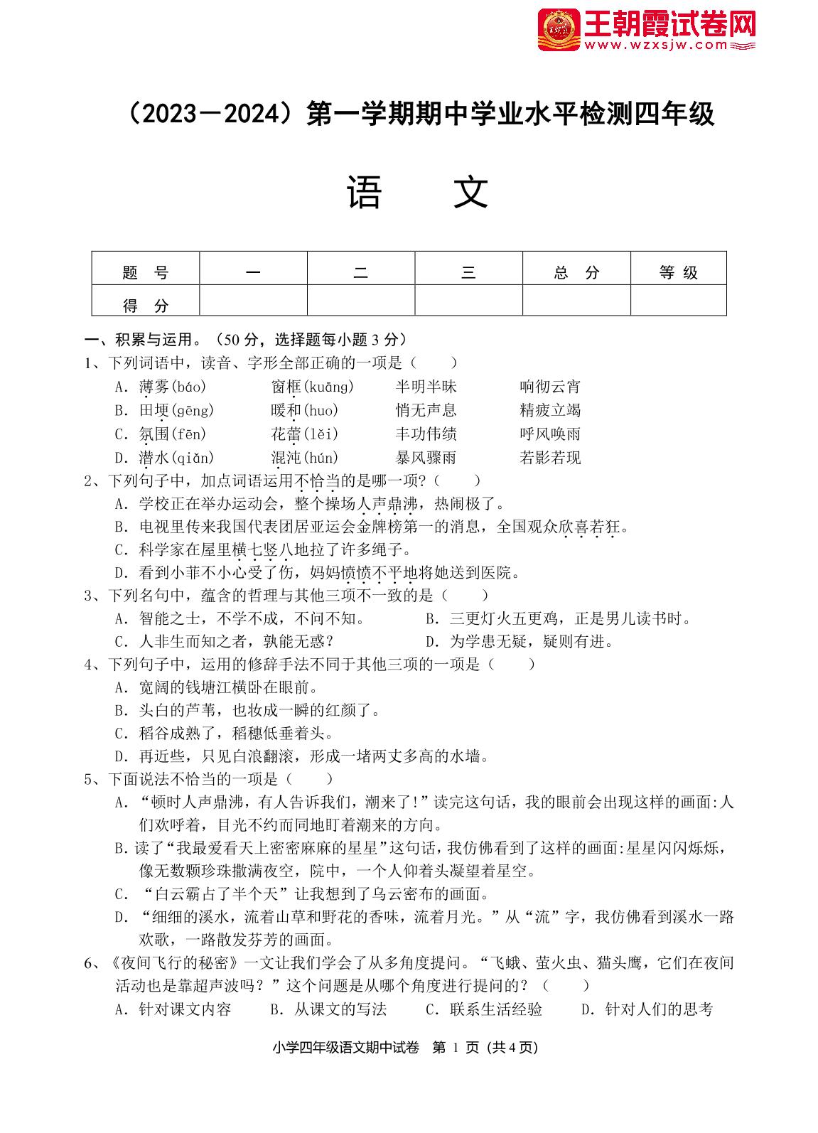湖北省孝感市应城市2023-2024学年第一学期期中学业水平检测四年级语文(人教版)