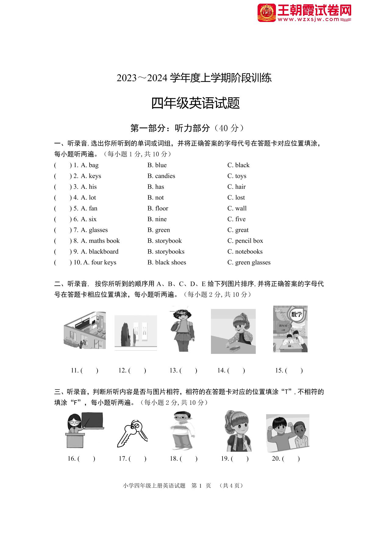 湖北省十堰市张湾区、郧阳区2023-2024学年度上学期期中阶段训练四年级英语(人教PEP版)