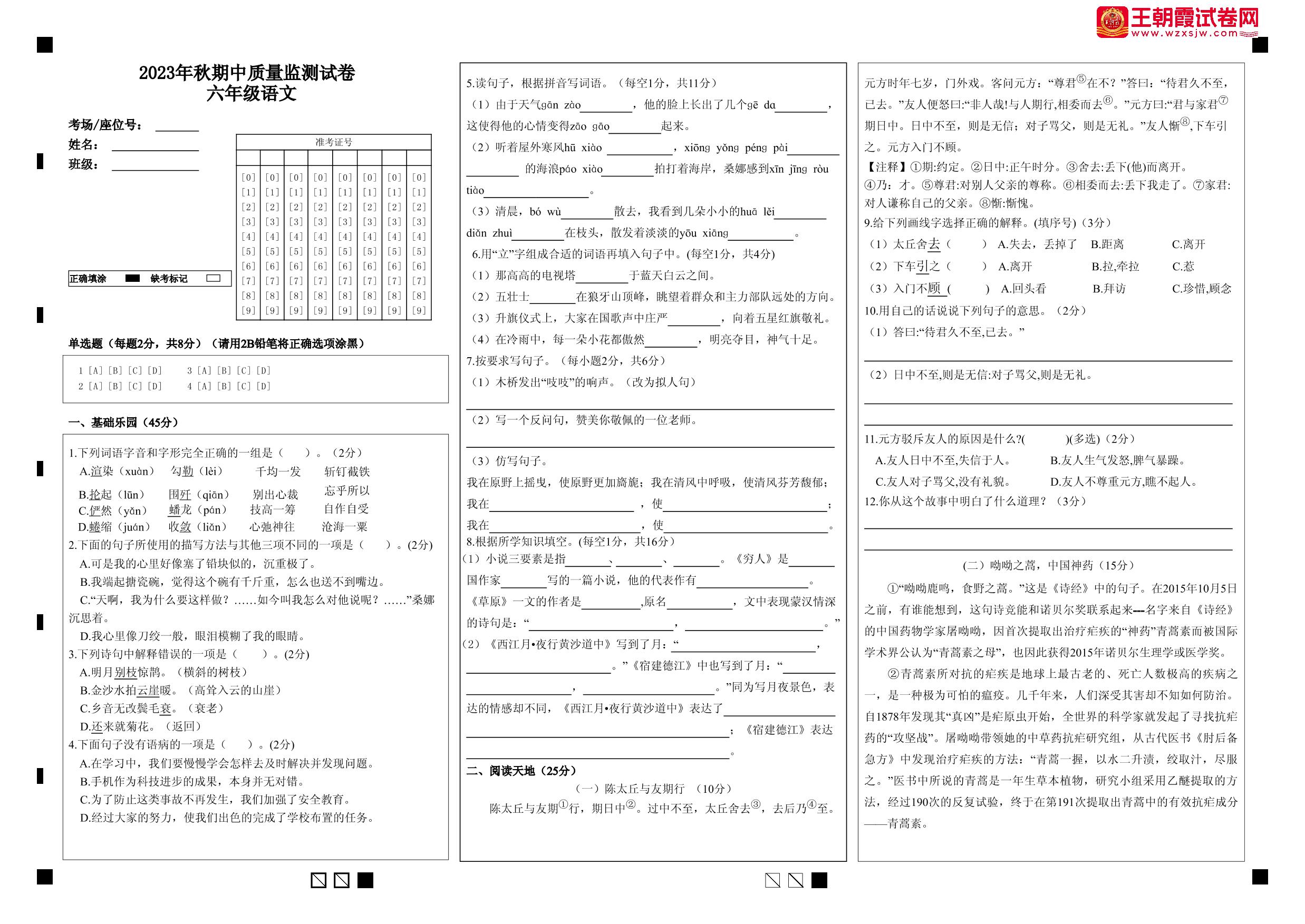 六年级语文人教版上册期中卷