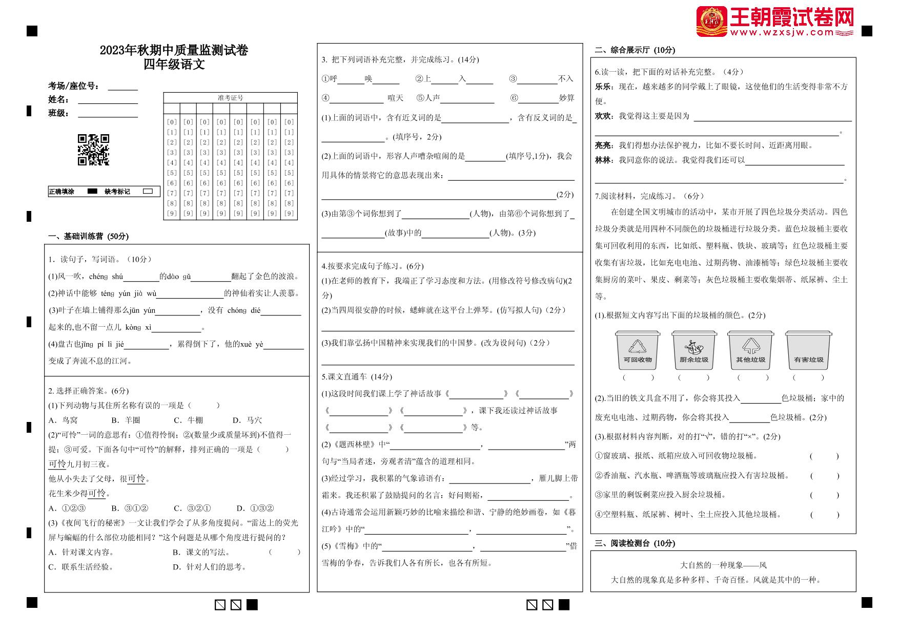 湖北省鄂州市鄂城区2023-2024学年上学期期中质量监测四年级语文(人教版)