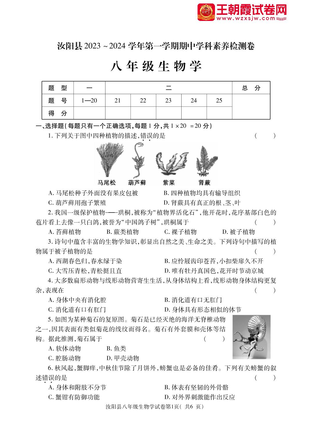 河南省洛阳市汝阳县2023-2024学年第一学期期中学科素养检测卷八年级生物(苏教版)