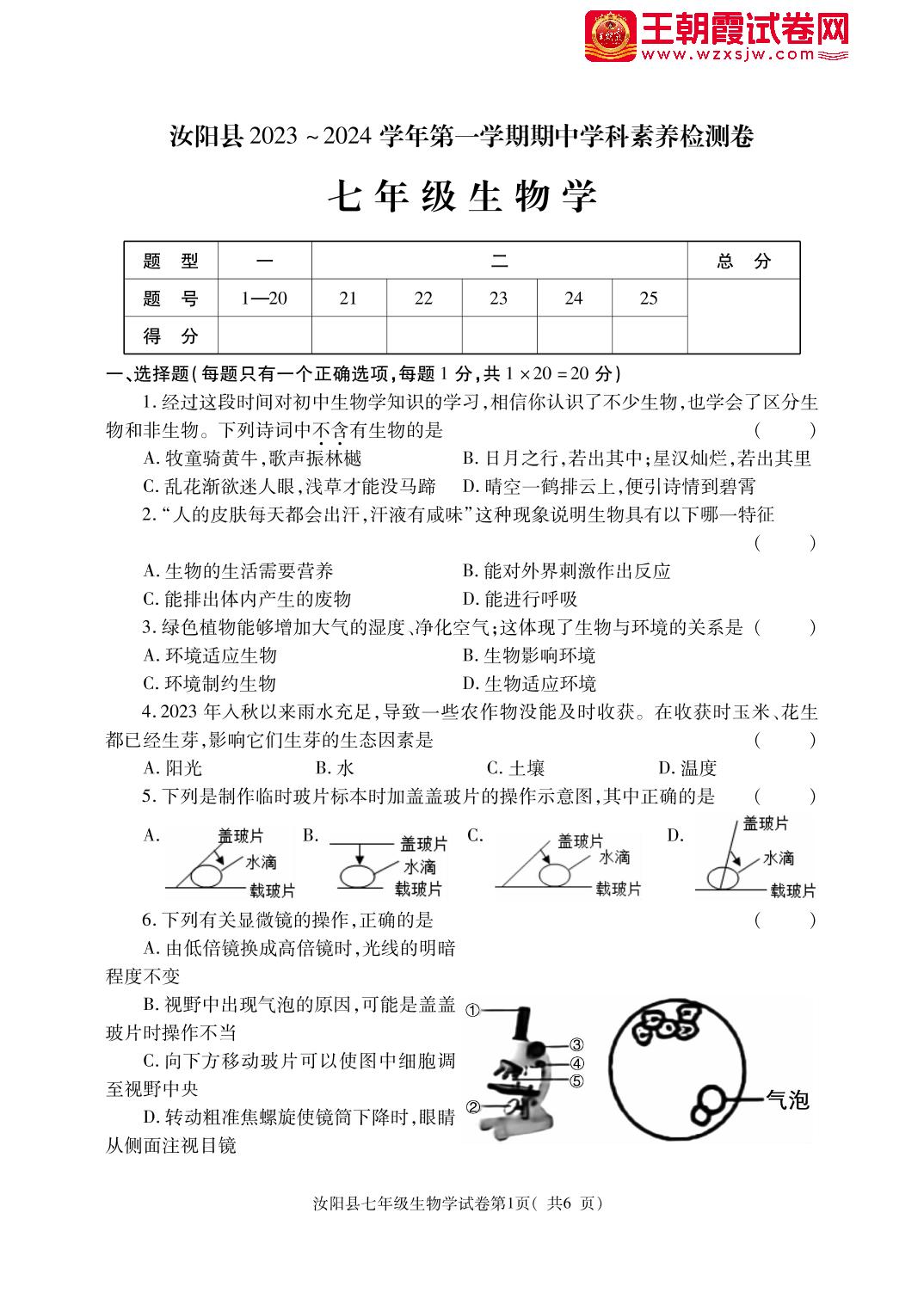 河南省洛阳市汝阳县2023-2024学年第一学期期中学科素养检测卷七年级生物(苏教版)