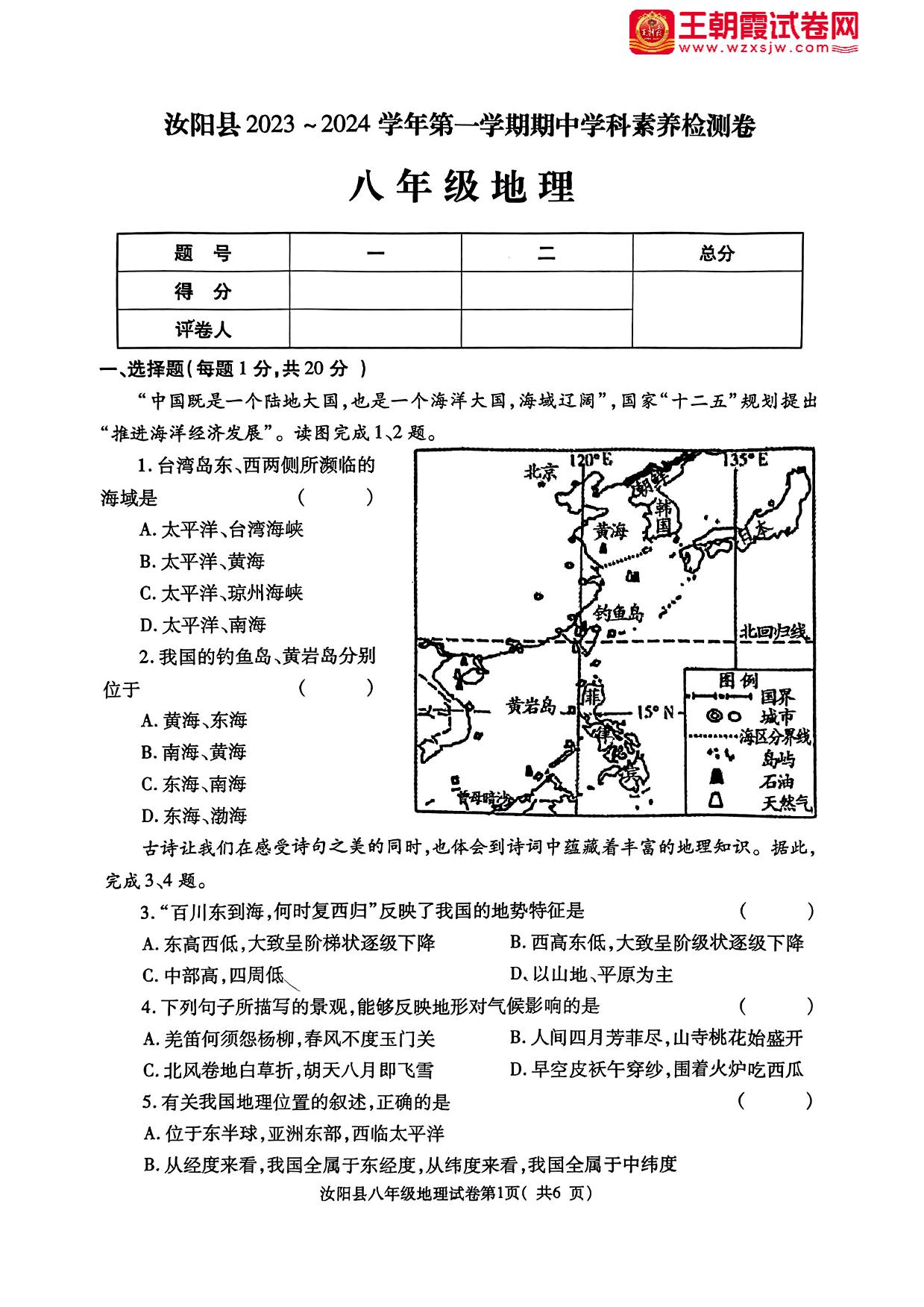 河南省洛阳市汝阳县2023-2024学年第一学期期中学科素养检测卷八年级地理(人教版)