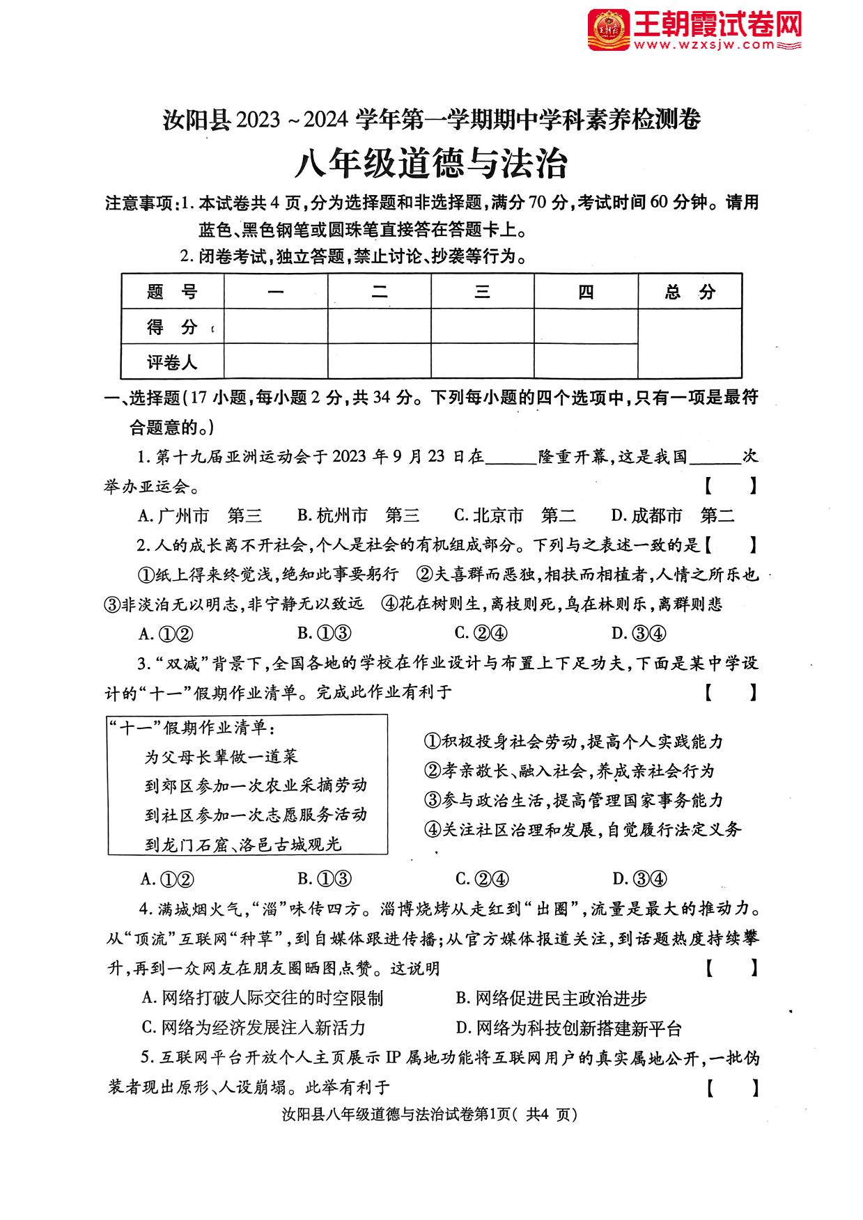 河南省洛阳市汝阳县2023-2024学年第一学期期中学科素养检测卷八年级道德与法治(人教版)