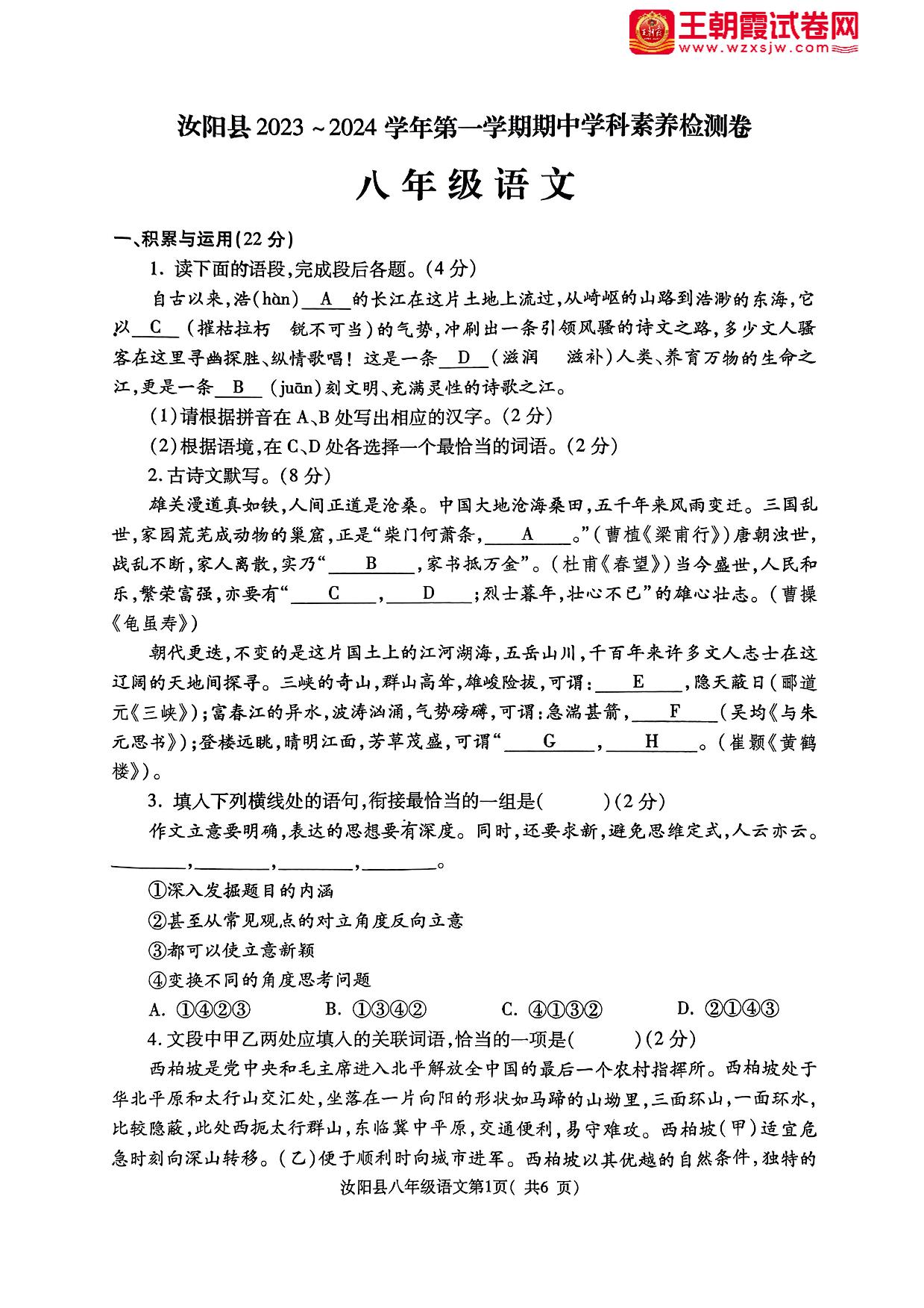 河南省洛阳市汝阳县2023-2024学年第一学期期中学科素养检测卷八年级语文(人教版)