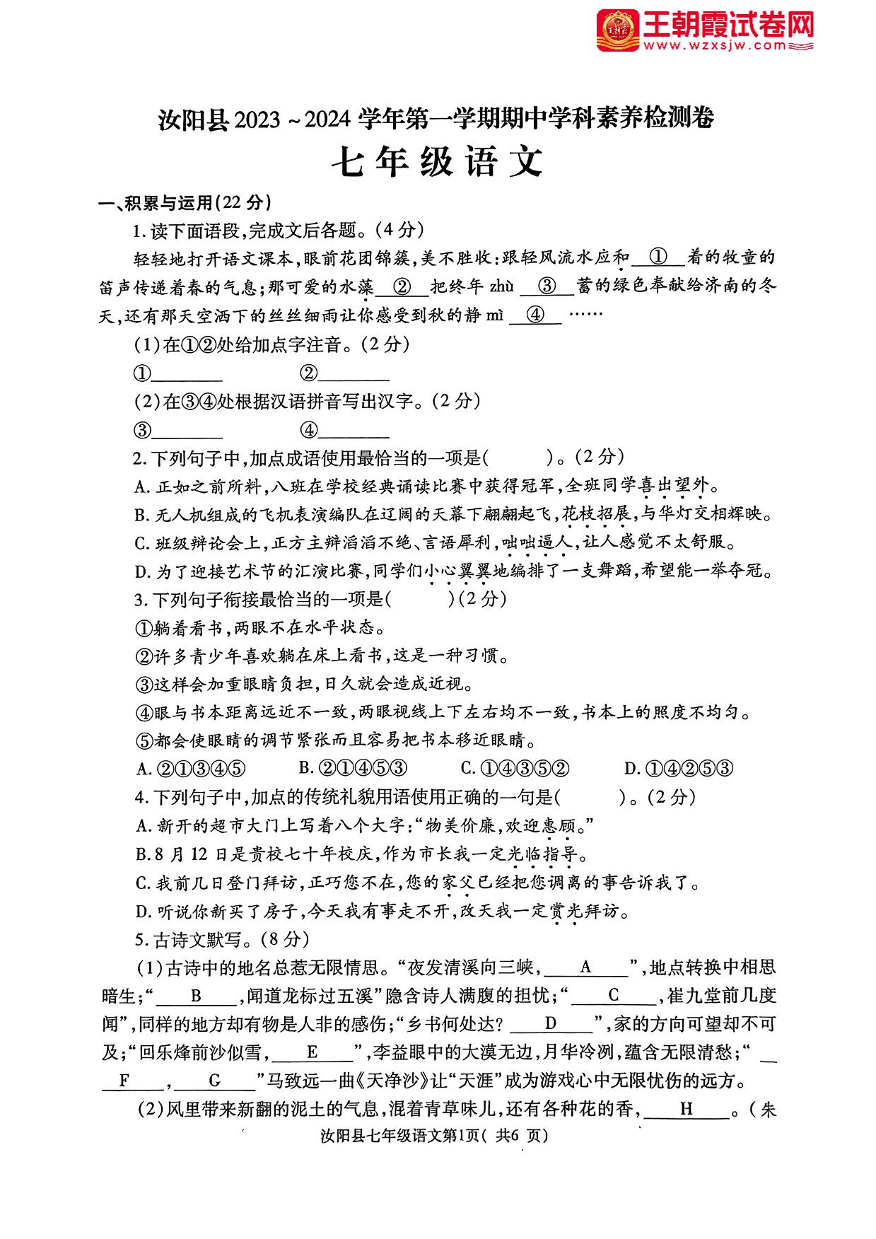 河南省洛阳市汝阳县2023-2024学年第一学期期中学科素养检测卷七年级语文(人教版)