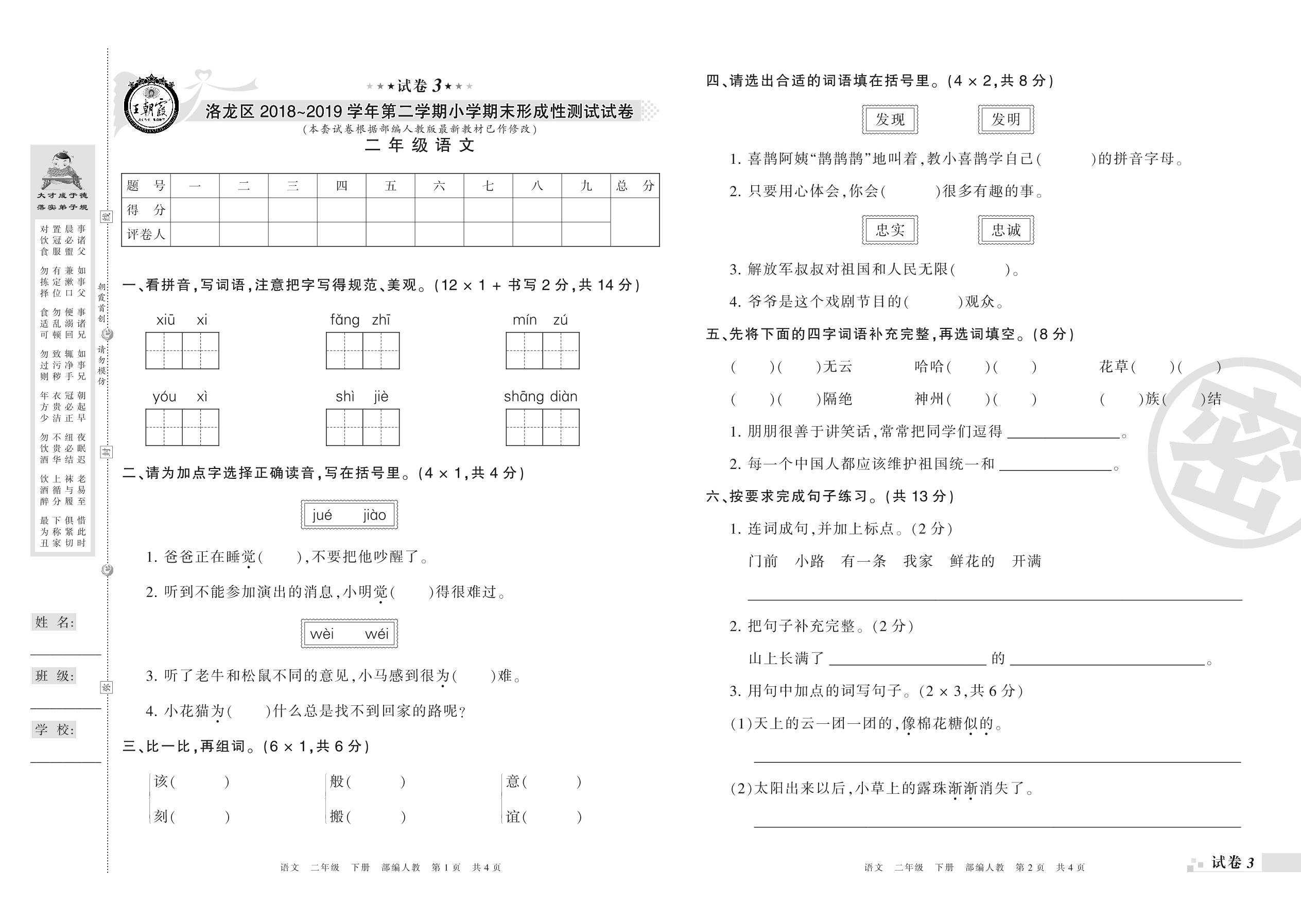2018-2019学年第二学期洛阳市洛龙区二年级语文试卷(人教版)【3】