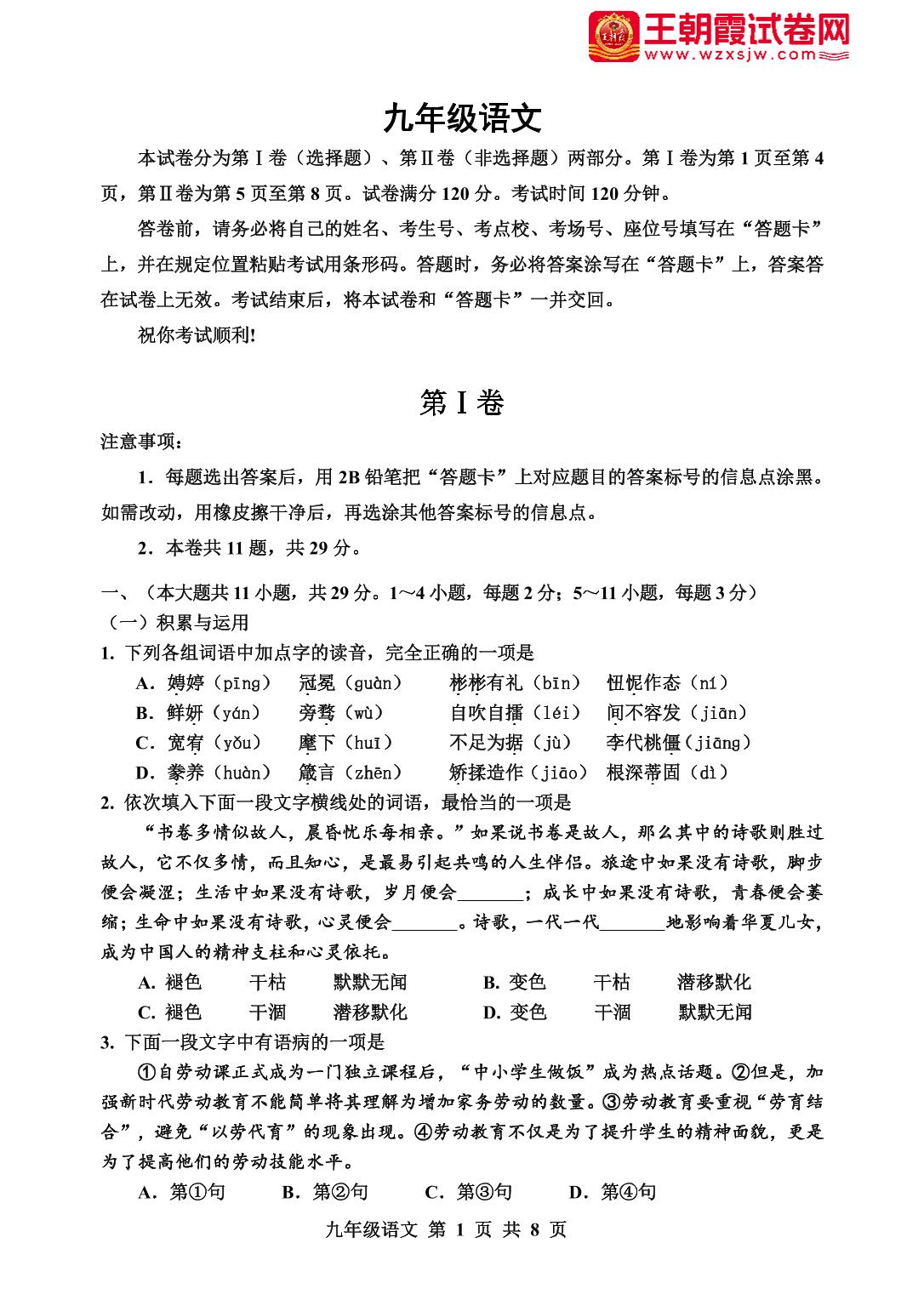 九年级语文人教版上册期中卷