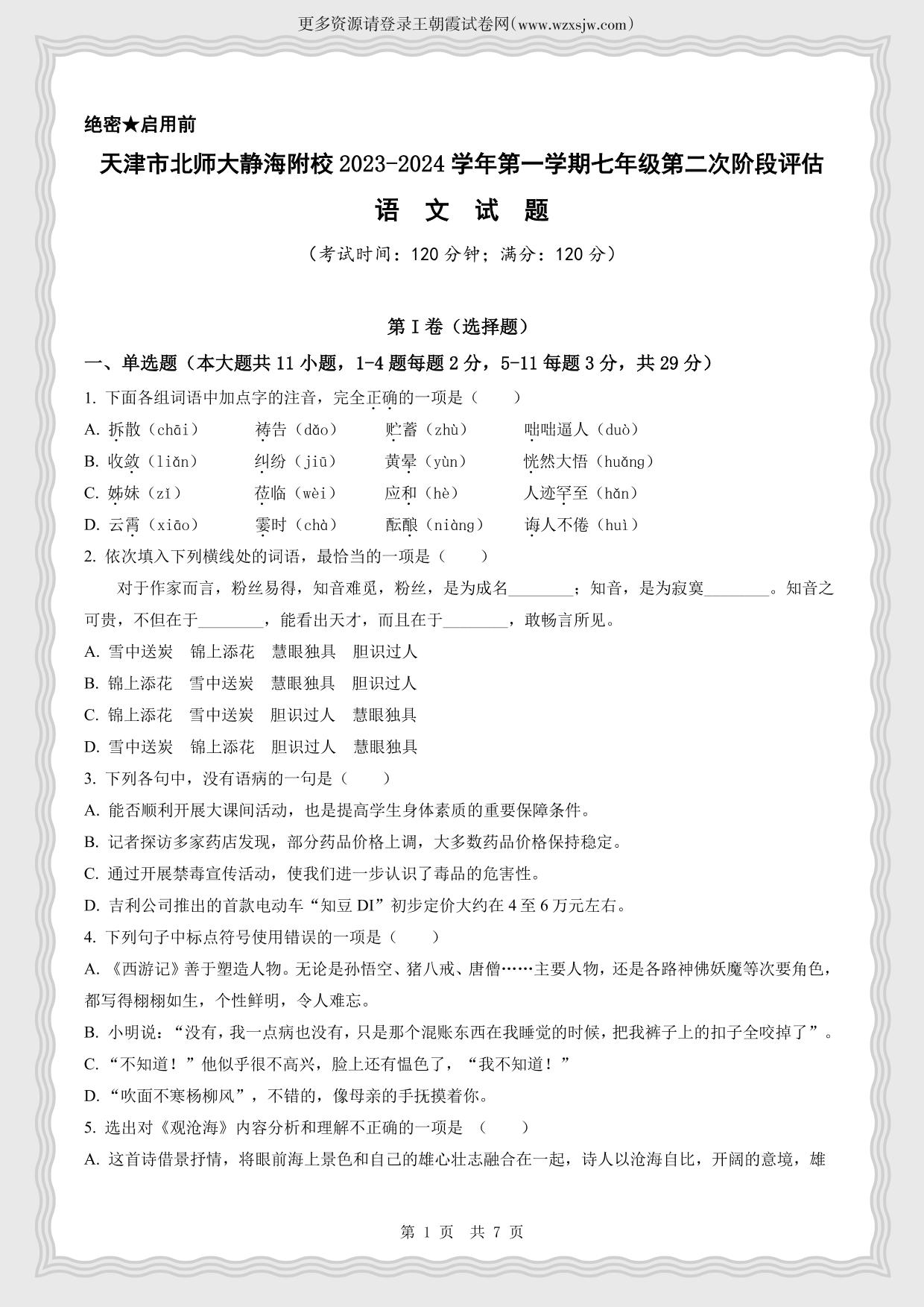 天津市北京师范大学静海附属学校2023-2024学年第一学期第二次阶段评估(期中)试题七年级语文(人教版)