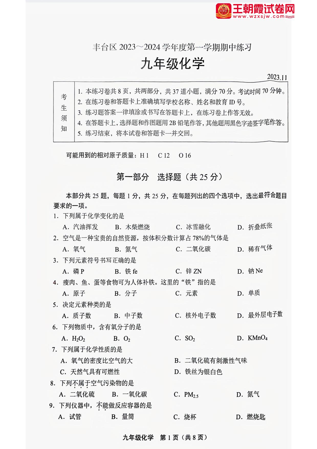 北京市丰台区2023-2024学年度第一学期期中练习九年级化学(人教版)