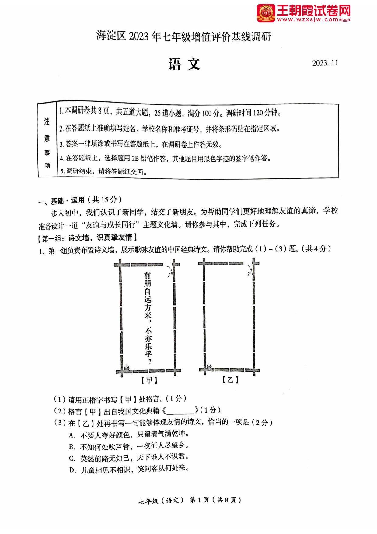 北京市海淀区2023-2024学年第一学期增值评价基线调研(期中)七年级语文(人教版)