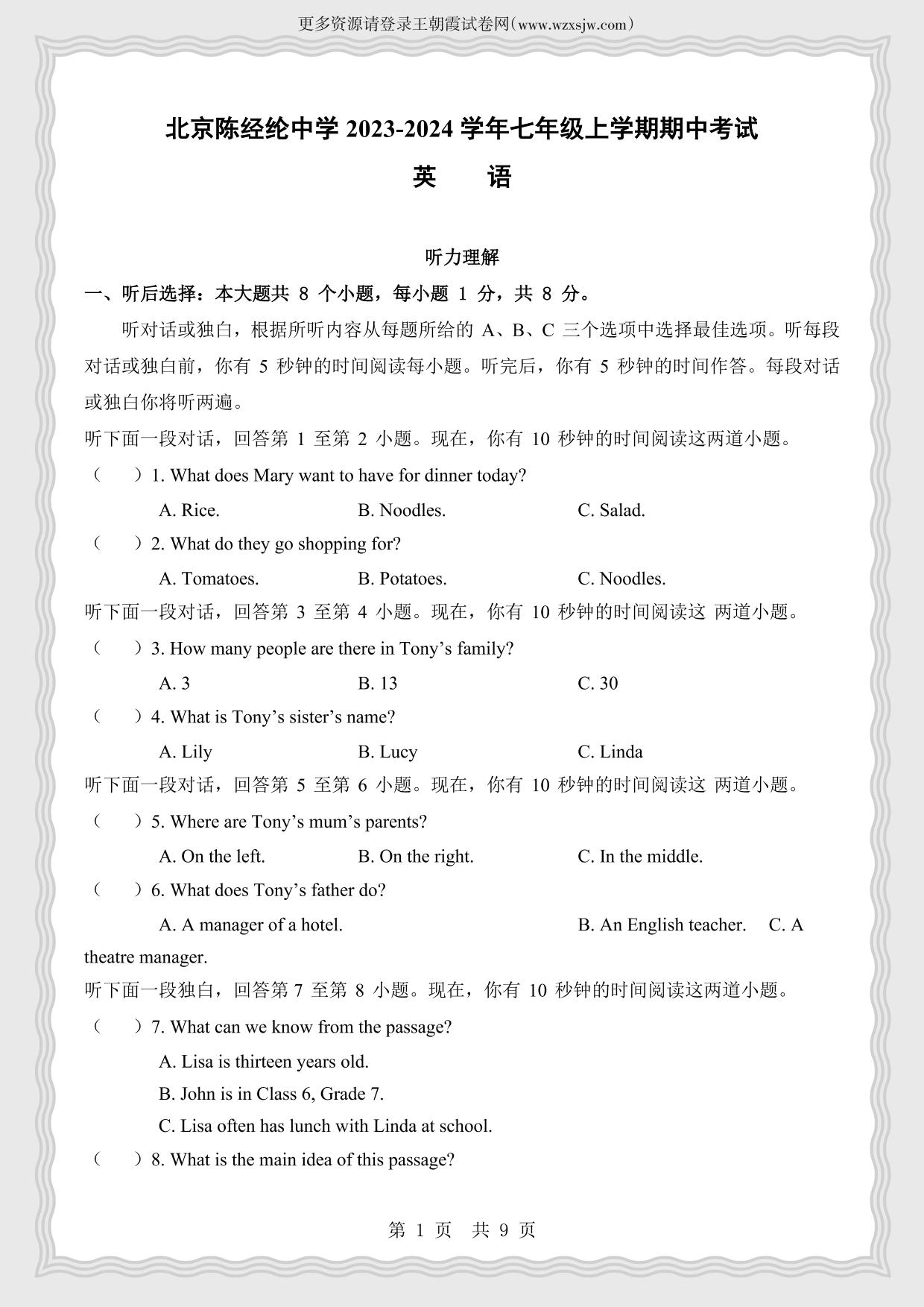 北京陈经纶中学2023-2024学年第一学期期中英语试题七年级英语(外研版)【无听力音频】