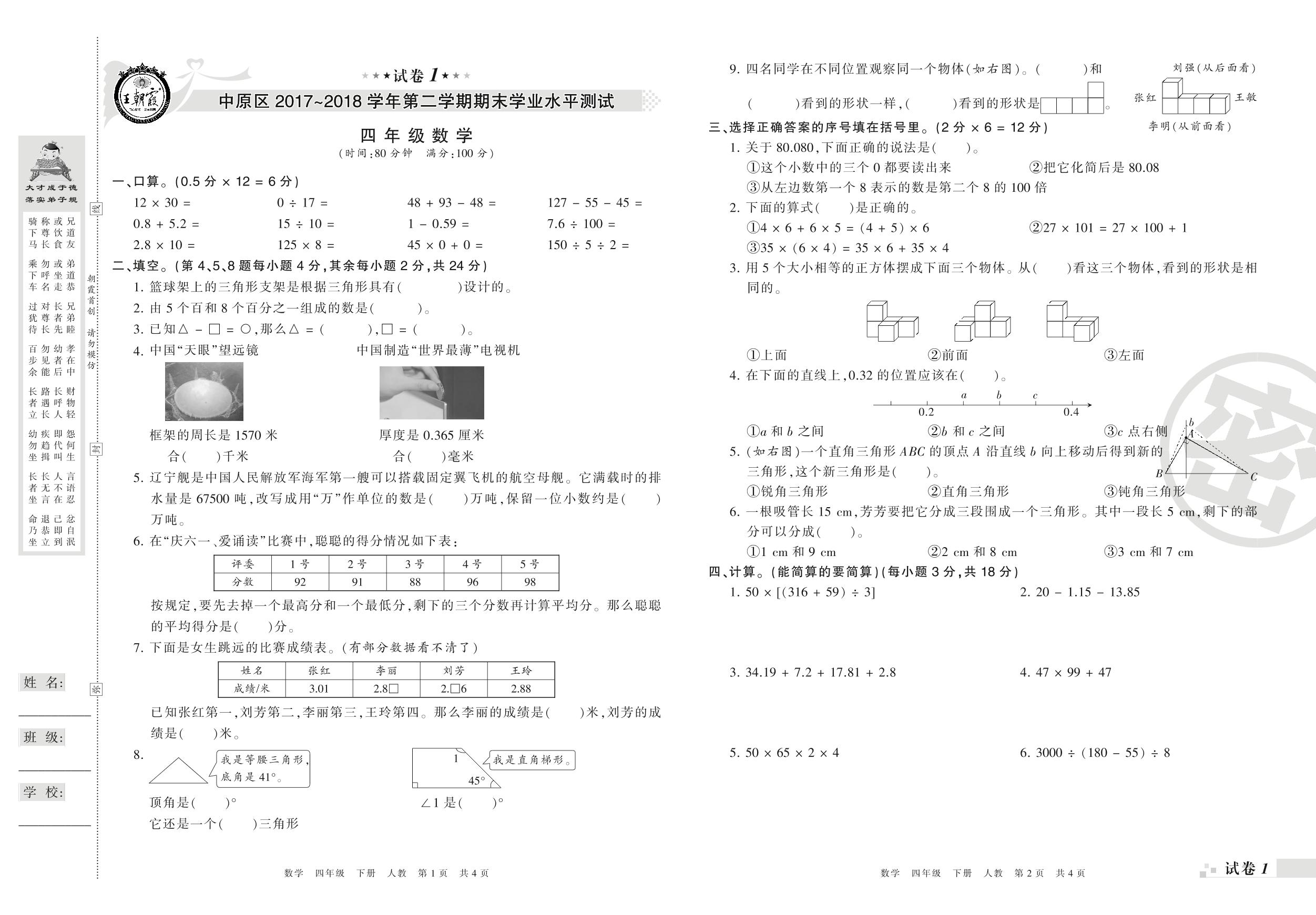 2017-2018学年第二学期郑州市中原区四年级数学试卷(人教版)_R210804151100【1】