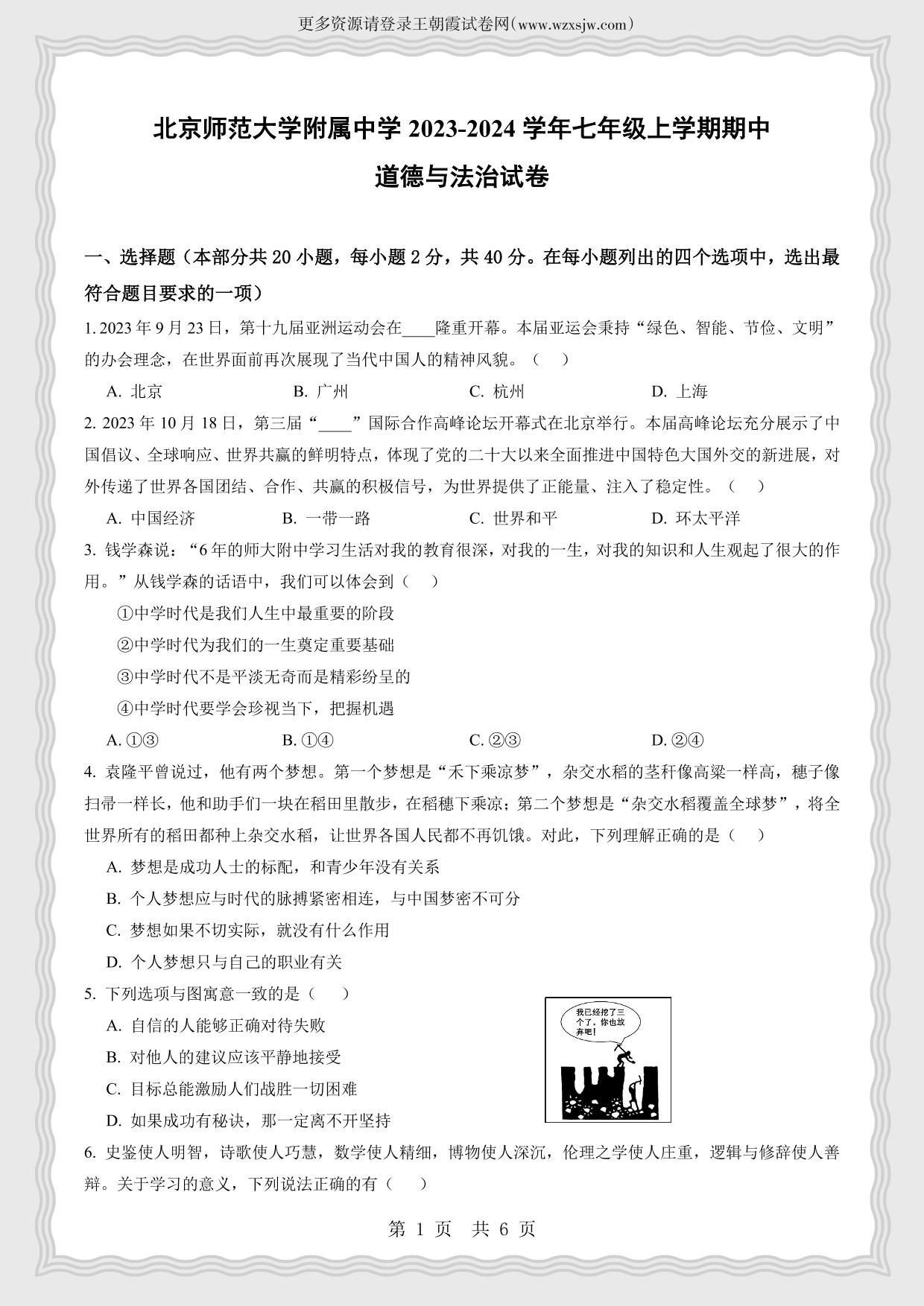 北京师范大学附属中学2023-2024学年第一学期期中试卷七年级道德与法治(人教版)