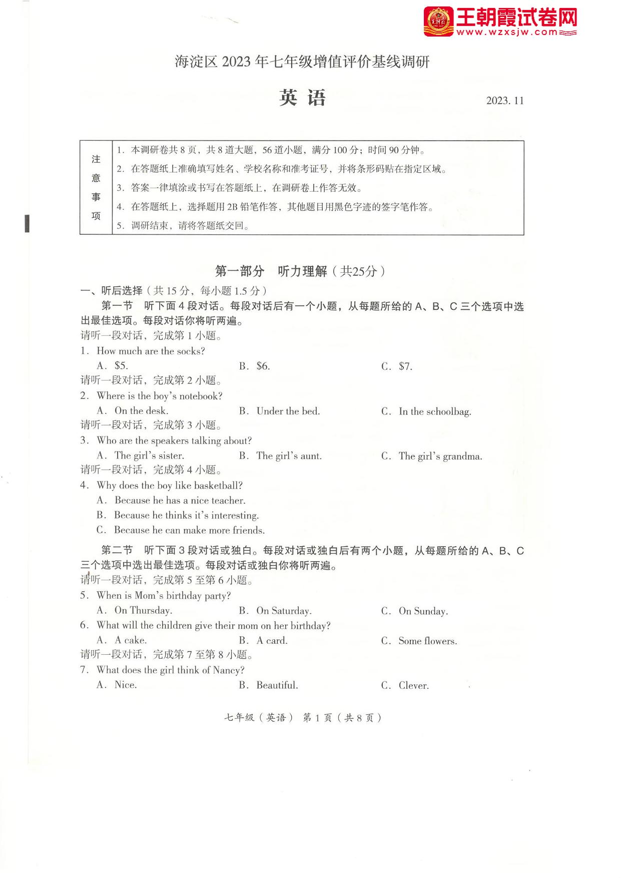 北京市海淀区2023-2024学年第一学期增值评价基线调研(期中)七年级英语(人教版)【无听力音频】