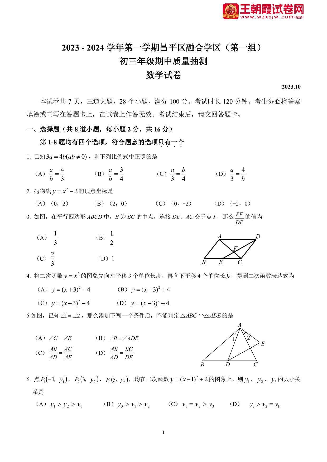 北京市昌平区融合学区2023-2024学年第一学期期中质量抽测(第一组)九年级数学(北京版)