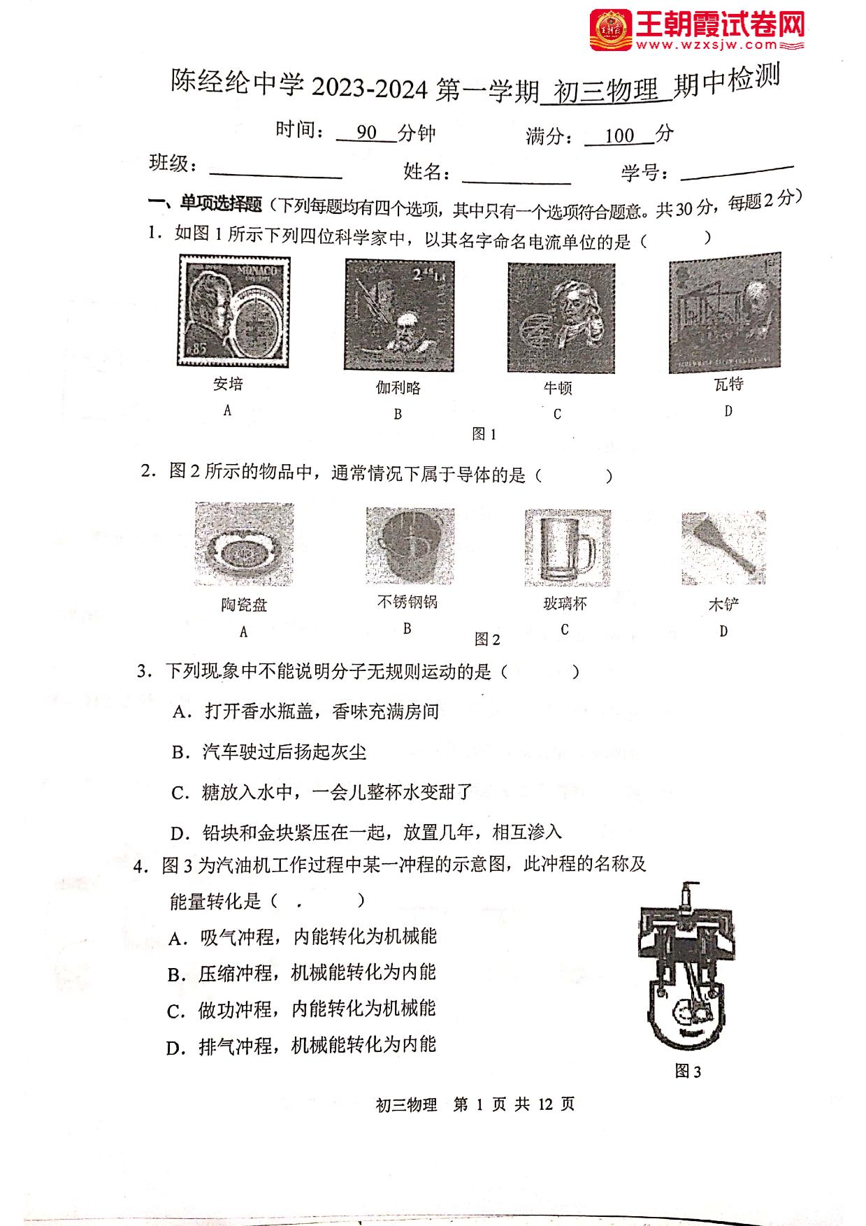 北京市陈经纶中学2023-2024学年第一学期期中检测九年级物理(人教版)