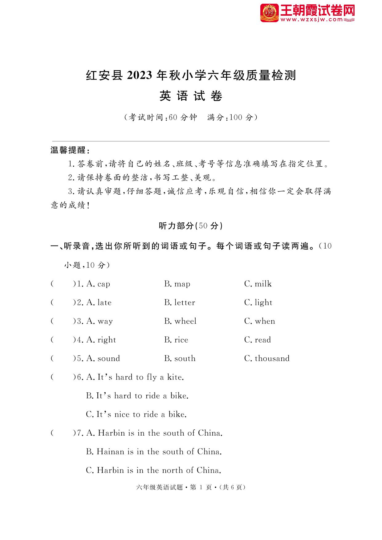 湖北省黄冈市红安县2023-2024学年第一学期质量检测(月考)六年级英语(人教PEP版)