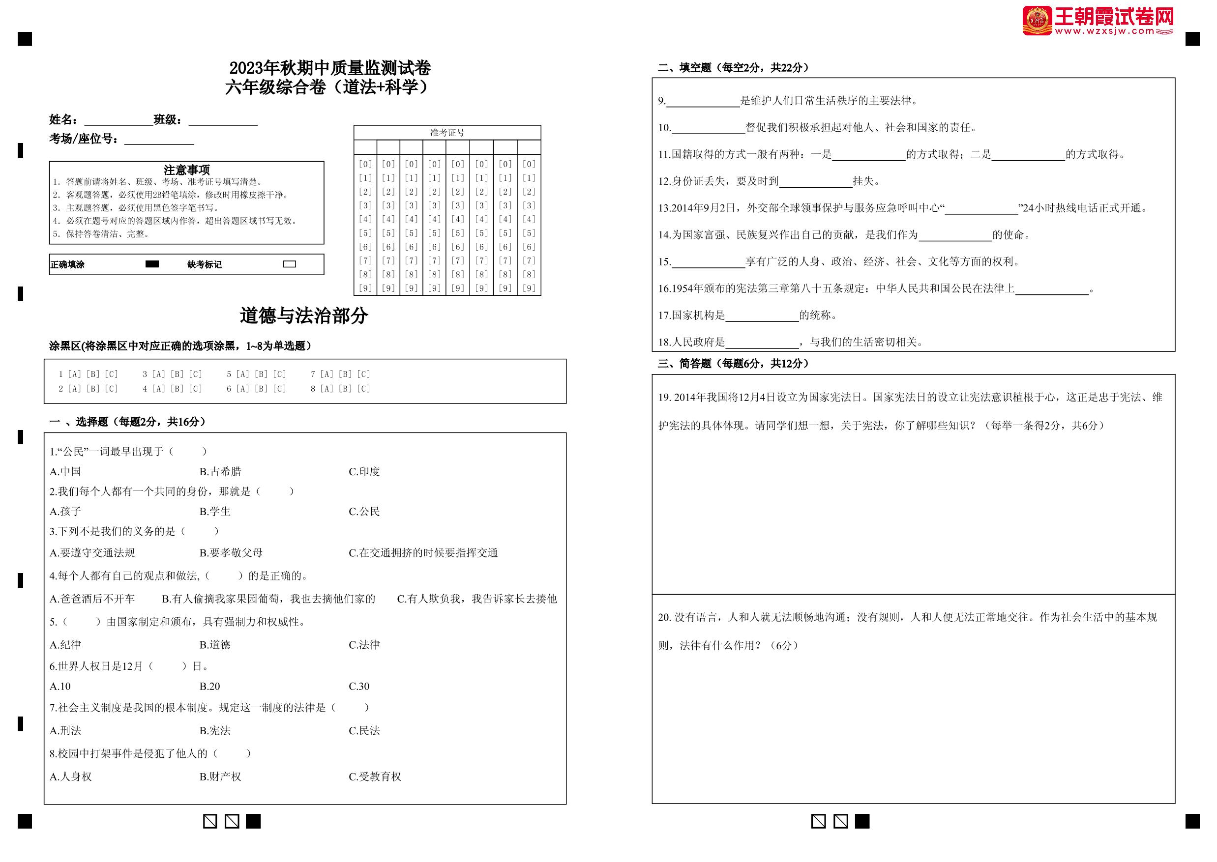 湖北省鄂州市鄂城区2023-2024学年上学期期中质量监测六年级道德与法治、科学综合卷