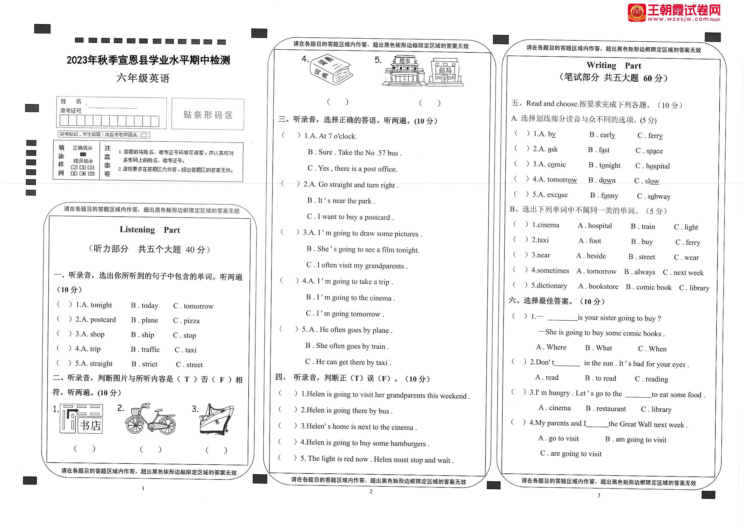 湖北省恩施土家族苗族自治州宣恩县2023-2024学年上学期学业水平期中检测六年级英语(人教PEP版)【无听力音频】