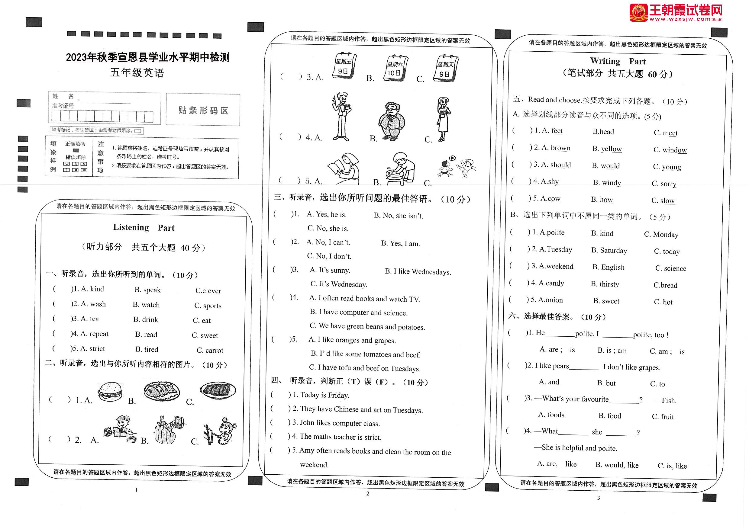 湖北省恩施土家族苗族自治州宣恩县2023-2024学年上学期学业水平期中检测五年级英语(人教PEP版)【无听力音频】